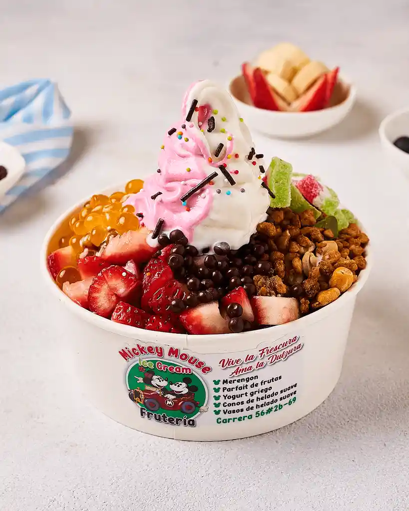 Combina 5 topping de tu elección, dos deben ser frutas. Ombinalo con el helado de tu preferencia, y agrega salsa de la casa