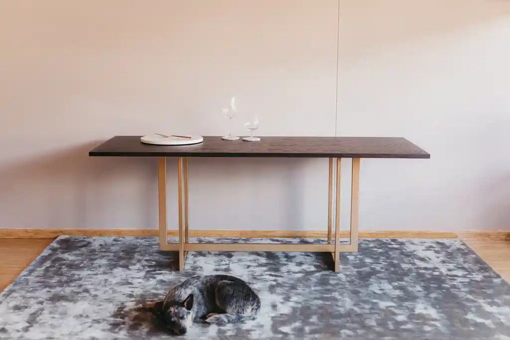 Mesa comedor de ocho puestos en madera oscura, con base en metal gold / Largo: 1.98 mts, Alto: 75 cms, Ancho: 80 cms