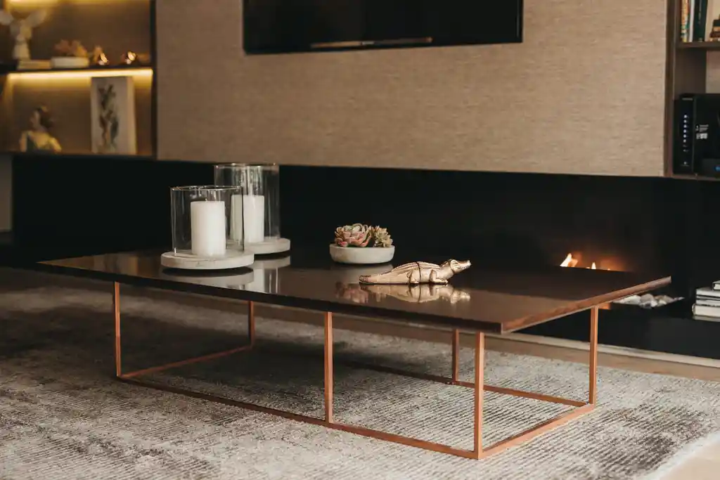 Mesa en madera concisa con patas en metal gold / Largo: 1.57 mts, Alto: 36 cms, Ancho: 90 cms