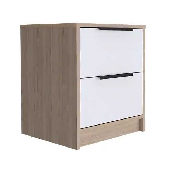 "Mesa de noche ares x 2 2 Nocheros prácticos y funcionales, de diseño moderno con combinación de colores, tiene 2 cajones por mesa de noche, fácil instalación y armado. Material: aglomerado melaminico. Medidas: 48 alto x 41 ancho x 36,3 fondo."