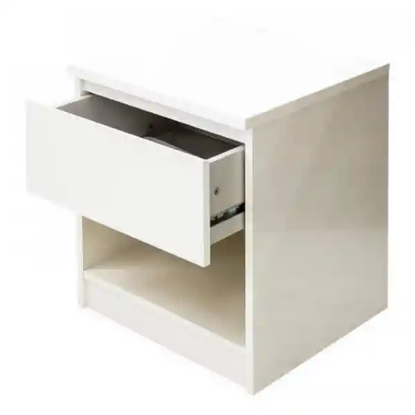Mesa de noche elaborada en madeflex. Color blanco. Tiene cajón con sistema de riel. Espacio en la parte inferior. Contraste brillant.e Ideal para todo tipo de habitacion. Diseño moderno. Ergonómica. Práctica.
