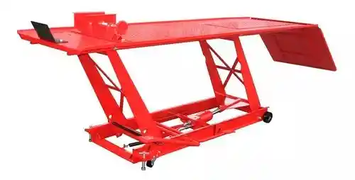 Tiene capacidad de levante para 1000 lbs la cual es suficiente para levantar casi cualquier moto o ATV Construcción de acero de alta resistencia. Adecuada para reparación y mantenimiento en la mayoría de las motos. Cuenta con un seguro para la llanta delantera que evita que la motocicleta se incline o caiga al suelo Sistema mixto Neumática e Hidráulica.