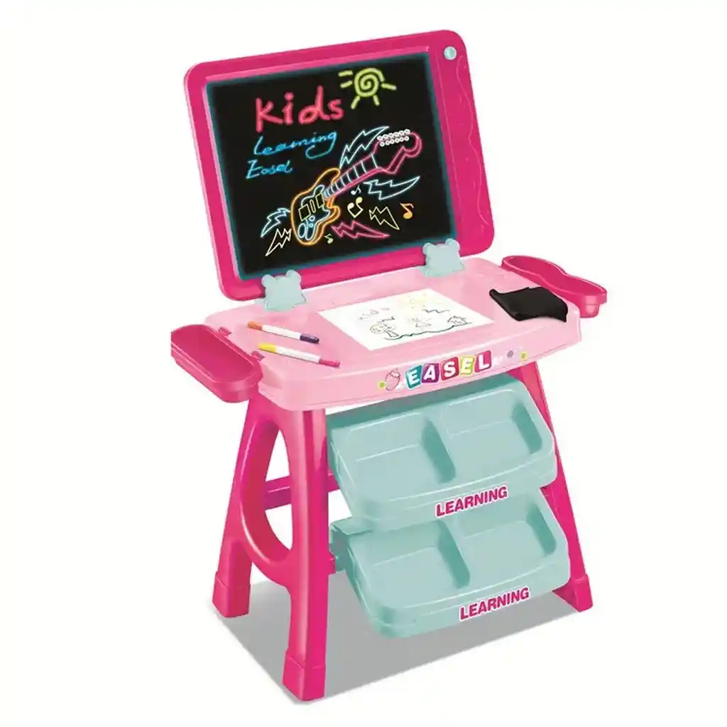 ¡Presentamos el Tablero Con Mesa de Dibujo para niños, Organizador y Luz Neón con funciones de retroiluminación oscura! Este es el juego de arte perfecto para su hijo, que combina la funcionalidad de un tablero, una mesa de tareas y un tablero portátil en un solo producto. Este Tablero Con Mesa de Dibujo viene con una práctica luz de neón con funciones de retroiluminación oscura que se puede utilizar por separado. Esta característica única permite a los niños dibujar y crear incluso en la oscuridad, lo que los hace sentir como verdaderos artistas. Además, esta luz crea un ambiente atractivo y acogedor que los niños adorarán. El tablero en sí cuenta con una superficie de dibujo lisa y fácil de limpiar que es ideal para trabajar con marcadores 3 en 1 que se incluyen en el paquete. Estos marcadores son ideales para dibujar, escribir y colorear en una variedad de superficies, lo que significa que su hijo tendrá muchas opciones para expresar su creatividad. La mesa de tareas integrada es lo suficientemente grande como para acomodar todos los suministros de arte de su hijo y también es fácil de limpiar. Además, el organizador de almacenamiento incorporado ayuda a mantener todos los materiales de arte en su lugar, lo que facilita el proceso de limpieza después de cada sesión de arte. // El producto incluye baterías /// Ficha Técnica: Dimensiones del producto armado : 74 cm x 43 cm x 39,5 cm Edad Apta : + 3 años Certificado de conformidad: SL-CS-210044 Referencia: JD1200 ** _Para defectos de fábrica o retractos: \_Por favor revise el producto apenas lo reciba y antes de usarlo. No aplican ley de retracto o defectos de fábrica luego de usar el producto. Se manejan máximo 5 días para reportar defectos de fábrica (por ejemplo, producto funciona mal, piezas faltantes, rotas, etc). Para hacer efectiva la devolución el producto debe devolverse con el empaque original, el cual debe estar en buen estado, incluir todos los documentos y las partes completas y sin daños.
