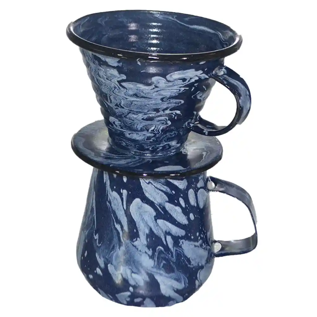 Nuestro dripper Valkyrja es un novedoso método para filtrar café. Está fabricado con 3 baños de peltre, material reconocido por sus propiedades de asepsia. El peltre no conduce ni sabores ni olores propiedades que hacen de este método perfecto para obtener una taza limpia y pura, por estas cualidades puedes lavar nuestros productos con cualquier tipo de jabón comercial sin preocuparte por que se transfieran sabores u olores. Valkyrja cuenta con un cuerpo cónico y estrías de manera horizontal sobre el cono que nos ayudan a oxigenar la bebida, lo que permite que el agua tenga una mejor fluidez. El fondo del método es plano y cuenta con 18 perforaciones permitiendo que el café no se repose y podamos tener una extracción perfecta. La oreja tiene un agarre cómodo y un diseño que no transfiere el calor, reduciendo el riesgo de accidentes y quemaduras. El dripper Valkyrja nos brinda una taza nivelada y limpia, resaltando el dulzor y guardando una acidez media en la bebida. Valkyrja nos recuerda a los utensilios de cocina que en algún tiempo utilizaban nuestros ancestros, esto le da una estética vintage y versátil que le permite combinar con cualquier espacio. ¡Úsalo con distintos tipos de filtro! Puedes preparar tú café favorito con cualquier filtro comercial para V60, Melitta, Chemex o Espro. Su forma y tamaño le permiten ser un método muy versátil en taza, nos da la posibilidad de tener una taza con un sabor único. Valkyrja se caracteriza por revelar sabores ocultos en nuestras preparaciones y dejar su sello en las bebidas. El server tiene una capacidad de 600 ml, está fabricada con el mismo material y procesos que Valkyrja. Sus colores combinan perfectamente, hacen de este set un perfecto regalo para una persona especial. Producto 100% fabricado en Colombia. Medidas dripper. Diámetro: 12.5 cm Alto: 10 cm Medidas server. Diámetro: 9.5 cm Alto: 11.5 cm