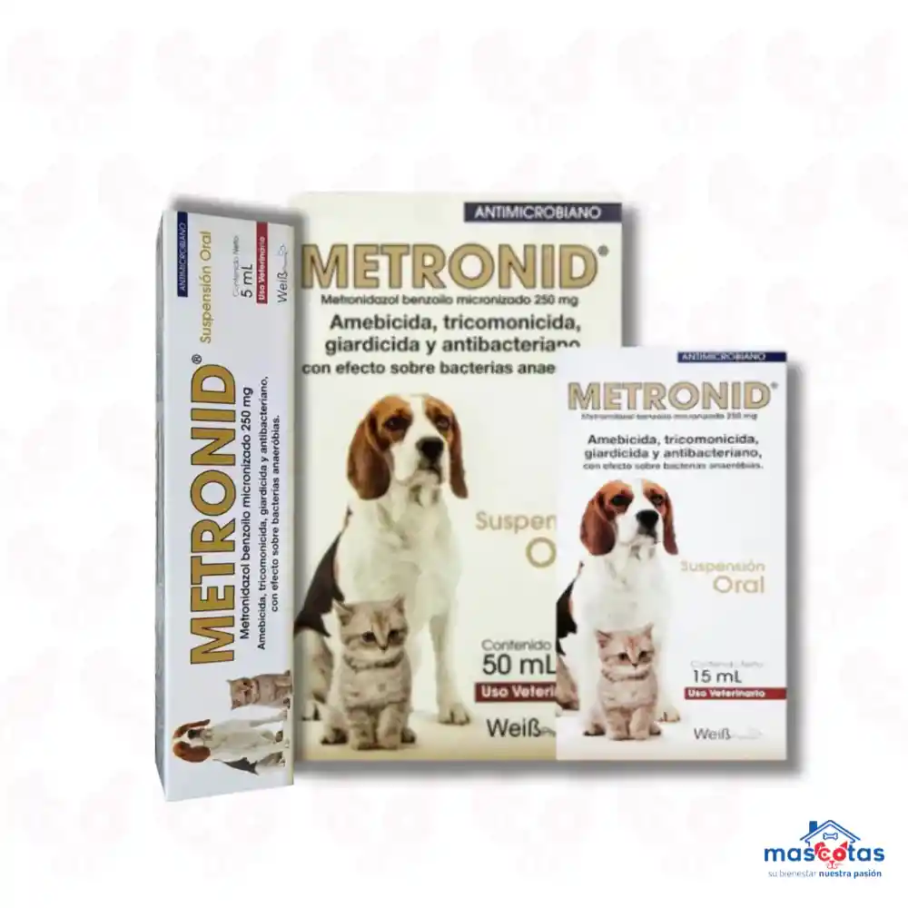 Metronid está indicado en perros y gatos para el tratamiento de infecciones causadas por protozoarios y bacterias anaerobias. También, está indicado en abscesos abdominales, peritonitis, infecciones genitales, periodontitis, otitis media, osteítis, artritis, meningitis, en tejidos necróticos, amebiasis intestinal, hepática, absceso amebiano, uretritis por tricomonas, gastritis y duodenitis. Su efecto amebicida, tricomonicida, giardicida y antibacteriano, con efecto sobre bacterias anaeróbicas. Cuenta con la adición de Podophyllum Peltatum, trituración homeopática indicada en el tratamiento de mucosas sangrantes y desórdenes gastrointestinales causadas por parásitos, bacterias y protozoarios. Metronid se puede usar con corticosteroides para tratar la enfermedad inflamatoria intestinal o enfermedad de las encías (gingivitis / estomatitis) en los gatos.