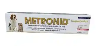 Metronid Jeringa 5 ml es un medicamento veterinario formulado para el tratamiento de infecciones gastrointestinales y protozoarias en mascotas, especialmente perros y gatos. Viene en presentación oral en jeringa, lo que facilita una dosificación práctica y precisa según indicación profesional.