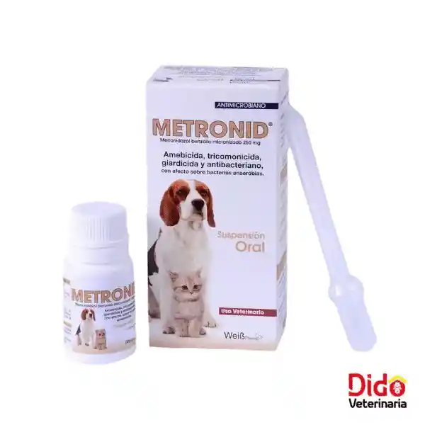 Metronid está indicado en perros y gatos para el tratamiento de infecciones causadas por protozoarios y bacterias anaerobias. También, está indicado en abscesos abdominales, peritonitis, infecciones genitales, periodontitis, otitis media, osteítis, artritis, meningitis, en tejidos necróticos, amebiasis intestinal, hepática, absceso amebiano, uretritis por tricomonas, gastritis y duodenitis. Su efecto amebicida, tricomonicida, giardicida y antibacteriano, con efecto sobre bacterias anaeróbicas. Cuenta con la adición de Podophyllum Peltatum, trituración homeopática indicada en el tratamiento de mucosas sangrantes y desórdenes gastrointestinales causadas por parásitos, bacterias y protozoarios. Metronid se puede usar con corticosteroides para tratar la enfermedad inflamatoria intestinal o enfermedad de las encías (gingivitis / estomatitis) en los gatos.