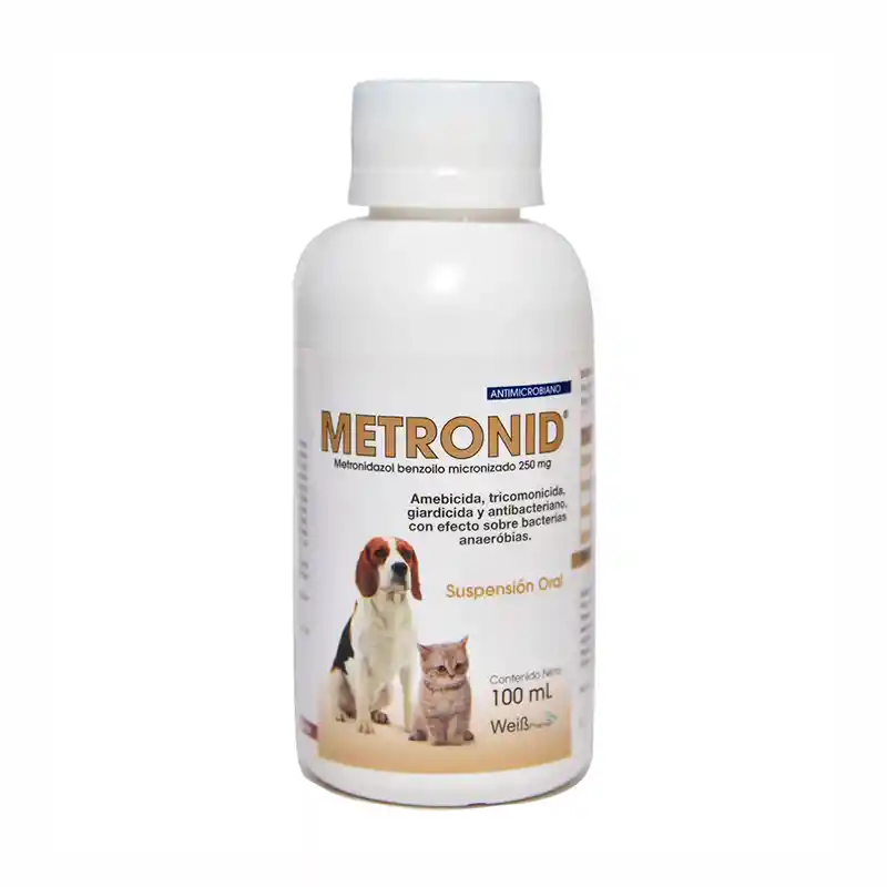 Metronid, es un compuesto antiparasitario interno para perros y gatos, del grupo de los nitroimidazoles. Metronid es captado por bacterias anaeróbicas y protozoarios sensibles por razón de la habilidad de estos microorganismos de reducir intracelularmente al Metronidazol a su forma activa. Dosis: Debido a la variedad de usos para este medicamento, cantidad de la dosis, frecuencia y duración del tratamiento varían ampliamente y están a criterio del médico veterinario Perros y gatos: De 10 a 50 mg /kg de peso cada 12 horas en la practica 0.04 a 0.2 ml por kilo de peso cada 12 horas (preferiblemente repartidas en tres tomas) durante 5 a 10 días. Método de Administración: Suspensión Oral. Contraindicaciones: Efectos secundarios: Salivación excesiva, náuseas, regurgitación, vómitos y disminución del apetito. Precauciones: Debe evitarse o utilizarse con precaución en dosis reducidas, en animales con enfermedad hepática o renal. Uso veterinario. Manténgase fuera del alcance de los niños. No debe ser administrado a animales con trastornos hepáticos, hembras durante el primer tercio de la gestación. Tampoco debe ser usado en animales con, hipersensibilidad a los derivados imidazólicos o con enfermedades activas del Sistema Nervioso Central. Sobredosis: Perros y gatos: Los síntomas de sobredosis de metronidazol son los signos gastrointestinales (anorexia, vómitos) y signos neurológicos tales como depresión, ataxia, desorientación, inclinación de cabeza, temblores, bradicardia, rigidez, rigidez y convulsiones. Los signos de toxicidad crónica a menudo comienzan de siete a 12 días después del inicio del tratamiento. Después de que el fármaco se suspende, puede ser de varios días a dos semanas antes de que estos signos neurológicos comienzan a disminuir.