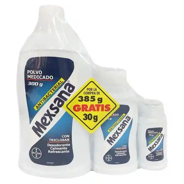 Contiene 3 Unidades Mexana Talco Antibacterial 300 g + Mexana Talco Antibacterial 85 g + Mexana Talco Antibacterial 30 g.