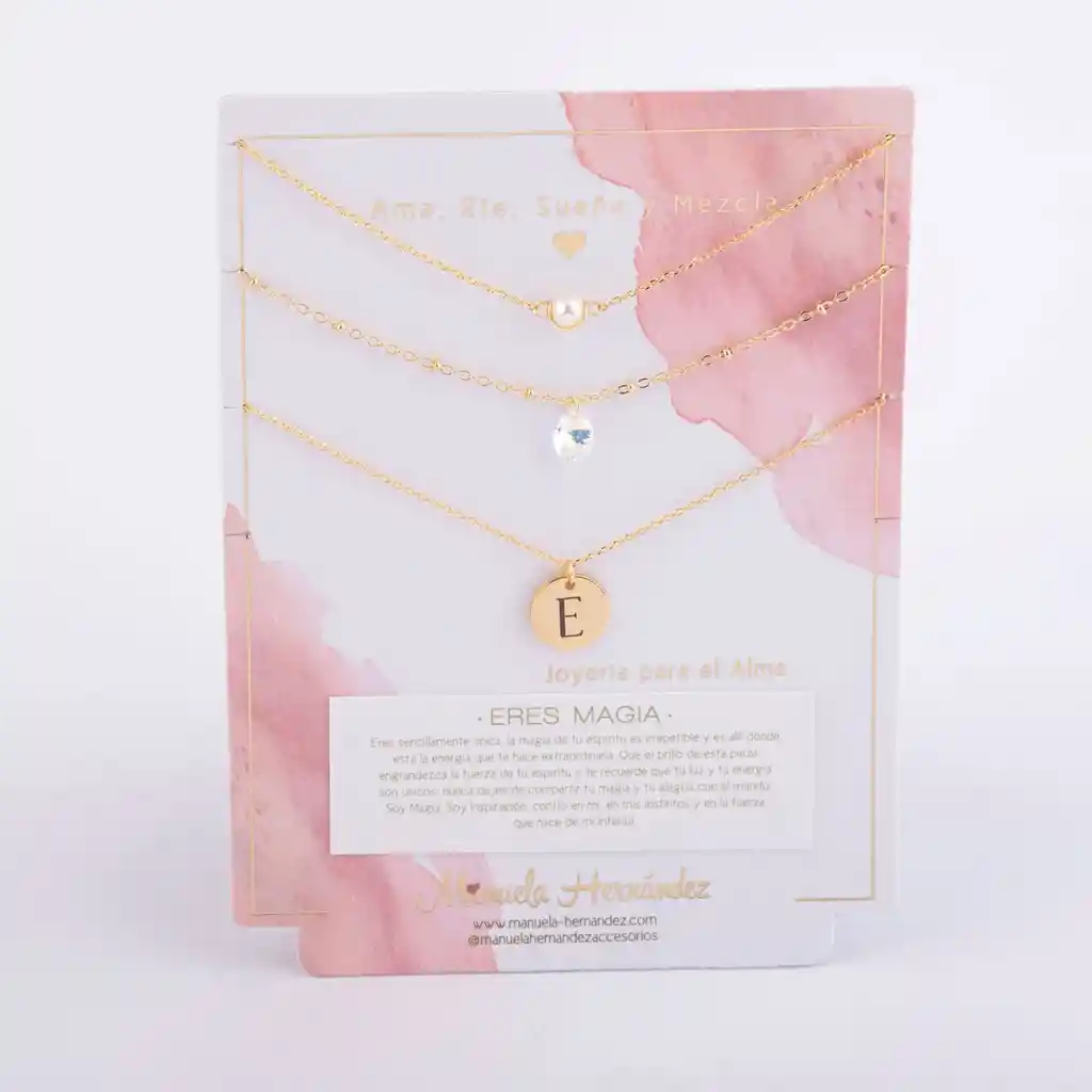 Este set de 3 collares en capas es un recordatorio suave y poderoso: eres magia. La perla, el cristal y tu inicial se alinean cerca del corazón para acompañarte todos los días, elevar tu energía y hacerte sentir única, luminosa y segura de lo que eres. ✨ Llévalo como amuleto o regálalo a alguien que amas: es de esos detalles que se vuelven ritual. *Características de tu Producto -Tipo: Set de 3 collares para layering. Este set es un Mix divino listo para llevar, donde cada pieza tiene la longitud perfecta para que te quede en capas y llevar un look súper poderoso. ¡Y lo mejor es que puedes utilizar los 3 collares juntos o por separado! -Diseño: -Collar 1: Cadena fina con perla natural cultivada (Longitud: 38cm + Extensión de 7.5cm) -Collar 2: cadena con cristal Swarovski certificado (Longitud: 40cm + Extensión de 7.5cm) -Collar 3: medalla con inicial (personalizable: eliges la letra) (Longitud: 45cm) -Estilo: Femenino, elegante y versátil ideal para usar juntos o por separado -Significado: Amor propio, brillo interior, identidad y confianza -Ideal para: Autoregalo, regalo para amigas/novia/mamá, cumpleaños, fechas especiales -Presentación: Tarjeta de marca con mensaje “Eres Magia” -Cuidado recomendado: Evita agua, perfumes y cremas guarda las piezas separadas para evitar enredos y proteger el cristal/perla. -Las cadenas y los apliques dorados cuentan con Baño de Oro 18k.
