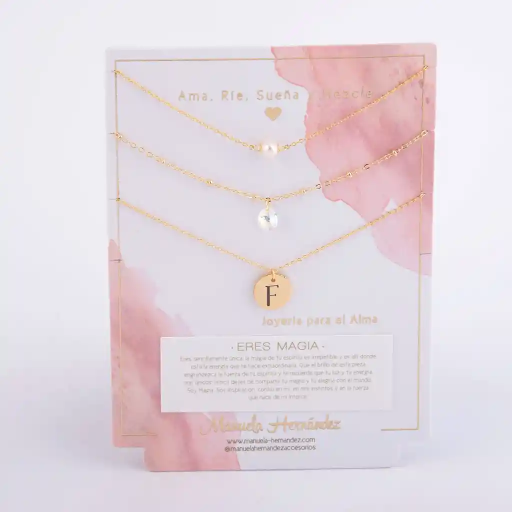 Este set de 3 collares en capas es un recordatorio suave y poderoso: eres magia. La perla, el cristal y tu inicial se alinean cerca del corazón para acompañarte todos los días, elevar tu energía y hacerte sentir única, luminosa y segura de lo que eres. ✨ Llévalo como amuleto o regálalo a alguien que amas: es de esos detalles que se vuelven ritual. *Características de tu Producto -Tipo: Set de 3 collares para layering. Este set es un Mix divino listo para llevar, donde cada pieza tiene la longitud perfecta para que te quede en capas y llevar un look súper poderoso. ¡Y lo mejor es que puedes utilizar los 3 collares juntos o por separado! -Diseño: -Collar 1: Cadena fina con perla natural cultivada (Longitud: 38cm + Extensión de 7.5cm) -Collar 2: cadena con cristal Swarovski certificado (Longitud: 40cm + Extensión de 7.5cm) -Collar 3: medalla con inicial (personalizable: eliges la letra) (Longitud: 45cm) -Estilo: Femenino, elegante y versátil ideal para usar juntos o por separado -Significado: Amor propio, brillo interior, identidad y confianza -Ideal para: Autoregalo, regalo para amigas/novia/mamá, cumpleaños, fechas especiales -Presentación: Tarjeta de marca con mensaje “Eres Magia” -Cuidado recomendado: Evita agua, perfumes y cremas guarda las piezas separadas para evitar enredos y proteger el cristal/perla. -Las cadenas y los apliques dorados cuentan con Baño de Oro 18k.