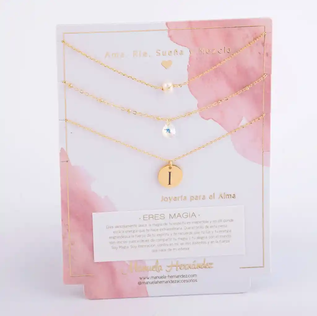Este set de 3 collares en capas es un recordatorio suave y poderoso: eres magia. La perla, el cristal y tu inicial se alinean cerca del corazón para acompañarte todos los días, elevar tu energía y hacerte sentir única, luminosa y segura de lo que eres. ✨ Llévalo como amuleto o regálalo a alguien que amas: es de esos detalles que se vuelven ritual. *Características de tu Producto -Tipo: Set de 3 collares para layering. Este set es un Mix divino listo para llevar, donde cada pieza tiene la longitud perfecta para que te quede en capas y llevar un look súper poderoso. ¡Y lo mejor es que puedes utilizar los 3 collares juntos o por separado! -Diseño: -Collar 1: Cadena fina con perla natural cultivada (Longitud: 38cm + Extensión de 7.5cm) -Collar 2: cadena con cristal Swarovski certificado (Longitud: 40cm + Extensión de 7.5cm) -Collar 3: medalla con inicial (personalizable: eliges la letra) (Longitud: 45cm) -Estilo: Femenino, elegante y versátil ideal para usar juntos o por separado -Significado: Amor propio, brillo interior, identidad y confianza -Ideal para: Autoregalo, regalo para amigas/novia/mamá, cumpleaños, fechas especiales -Presentación: Tarjeta de marca con mensaje “Eres Magia” -Cuidado recomendado: Evita agua, perfumes y cremas guarda las piezas separadas para evitar enredos y proteger el cristal/perla. -Las cadenas y los apliques dorados cuentan con Baño de Oro 18k.