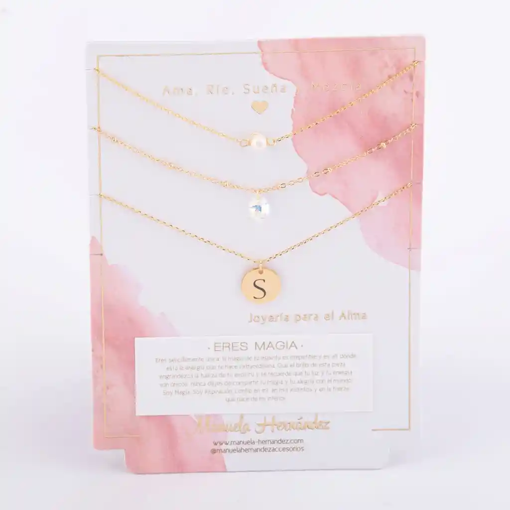 Este set de 3 collares en capas es un recordatorio suave y poderoso: eres magia. La perla, el cristal y tu inicial se alinean cerca del corazón para acompañarte todos los días, elevar tu energía y hacerte sentir única, luminosa y segura de lo que eres. ✨ Llévalo como amuleto o regálalo a alguien que amas: es de esos detalles que se vuelven ritual. *Características de tu Producto -Tipo: Set de 3 collares para layering. Este set es un Mix divino listo para llevar, donde cada pieza tiene la longitud perfecta para que te quede en capas y llevar un look súper poderoso. ¡Y lo mejor es que puedes utilizar los 3 collares juntos o por separado! -Diseño: -Collar 1: Cadena fina con perla natural cultivada (Longitud: 38cm + Extensión de 7.5cm) -Collar 2: cadena con cristal Swarovski certificado (Longitud: 40cm + Extensión de 7.5cm) -Collar 3: medalla con inicial (personalizable: eliges la letra) (Longitud: 45cm) -Estilo: Femenino, elegante y versátil ideal para usar juntos o por separado -Significado: Amor propio, brillo interior, identidad y confianza -Ideal para: Autoregalo, regalo para amigas/novia/mamá, cumpleaños, fechas especiales -Presentación: Tarjeta de marca con mensaje “Eres Magia” -Cuidado recomendado: Evita agua, perfumes y cremas guarda las piezas separadas para evitar enredos y proteger el cristal/perla. -Las cadenas y los apliques dorados cuentan con Baño de Oro 18k.