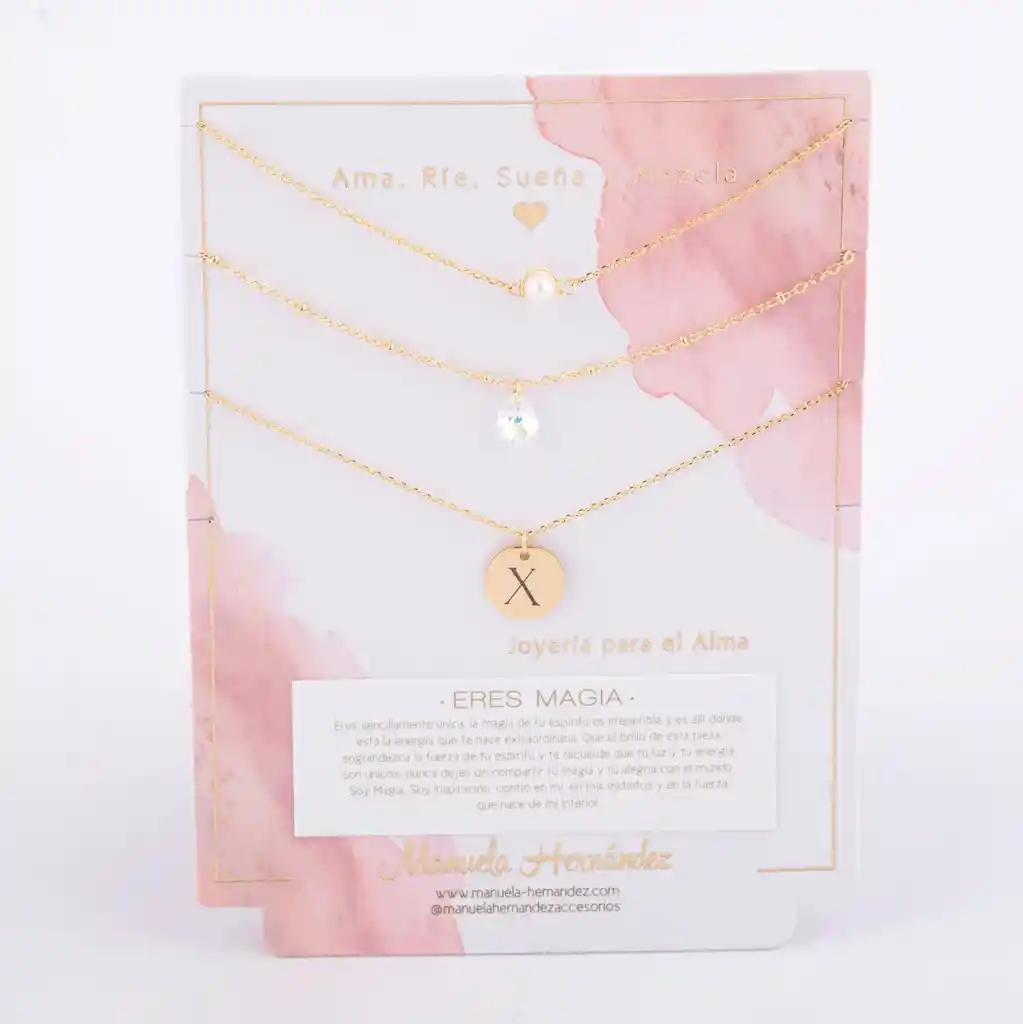Este set de 3 collares en capas es un recordatorio suave y poderoso: eres magia. La perla, el cristal y tu inicial se alinean cerca del corazón para acompañarte todos los días, elevar tu energía y hacerte sentir única, luminosa y segura de lo que eres. ✨ Llévalo como amuleto o regálalo a alguien que amas: es de esos detalles que se vuelven ritual. *Características de tu Producto -Tipo: Set de 3 collares para layering. Este set es un Mix divino listo para llevar, donde cada pieza tiene la longitud perfecta para que te quede en capas y llevar un look súper poderoso. ¡Y lo mejor es que puedes utilizar los 3 collares juntos o por separado! -Diseño: -Collar 1: Cadena fina con perla natural cultivada (Longitud: 38cm + Extensión de 7.5cm) -Collar 2: cadena con cristal Swarovski certificado (Longitud: 40cm + Extensión de 7.5cm) -Collar 3: medalla con inicial (personalizable: eliges la letra) (Longitud: 45cm) -Estilo: Femenino, elegante y versátil ideal para usar juntos o por separado -Significado: Amor propio, brillo interior, identidad y confianza -Ideal para: Autoregalo, regalo para amigas/novia/mamá, cumpleaños, fechas especiales -Presentación: Tarjeta de marca con mensaje “Eres Magia” -Cuidado recomendado: Evita agua, perfumes y cremas guarda las piezas separadas para evitar enredos y proteger el cristal/perla. -Las cadenas y los apliques dorados cuentan con Baño de Oro 18k.