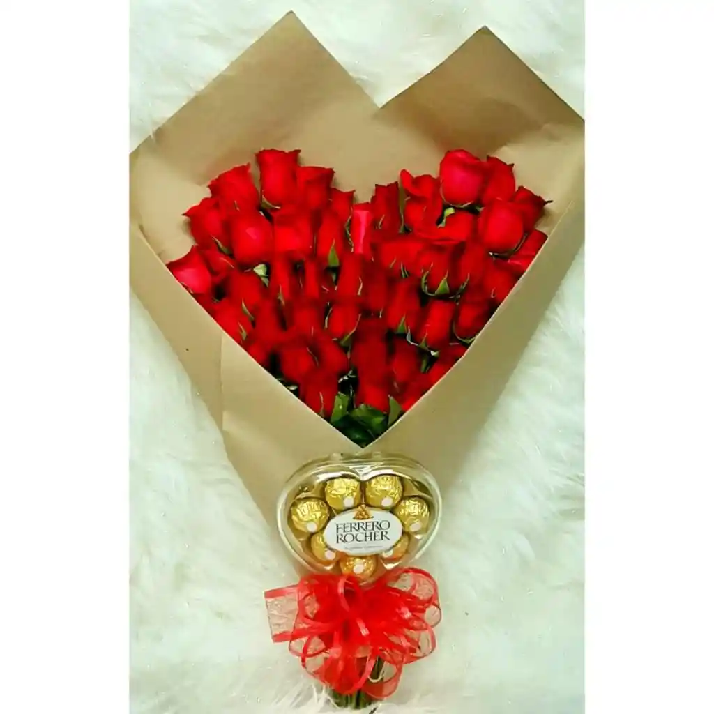 Bouquet corazón x 60 unidades + chocolates ferrero x 8 unidades