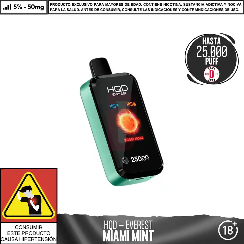 El HQD - Everest es un dispositivo desechable con 25,000 caladas aproximadas, pantalla táctil, 3 niveles de potencia y batería de larga duración. Su diseño moderno y resistencia de doble malla garantizan una experiencia de vapeo satisfactoria. Contenido del paquete: 1 dispositivo desechableConcentración de nicotina: 25000 PUFF - 5% de nicotina salina en peso Características del dispositivo: Dispositivo de vapeo desechable 28 ml de capacidad 1 dispositivo por paquete Batería: 850 mAh (Recargable) Hasta 25000 caladas aproximadamente. 3 modos de potencia : Boost mode - Regular mode - Soft mode. Ingredientes: Glicerina Vegetal, Propilenglicol, Aromatizantes Naturales y Artificiales, Ácido Benzoico, Nicotina. Advertencia: Contiene nicotina, que puede ser venenoso. Evitar el contacto con la piel y los ojos. No ingerir. Mantener siempre en empaque original y en un ambiente fresco y seco. Mantener alejado de niños y mascotas. No debe utilizarse por Mujeres en estado de embarazo o personas con problemas de respiración como el asma. En caso de accidente contacte a la línea 123. PROHIBIDA LA VENTA A MENORES DE 18 AÑOS