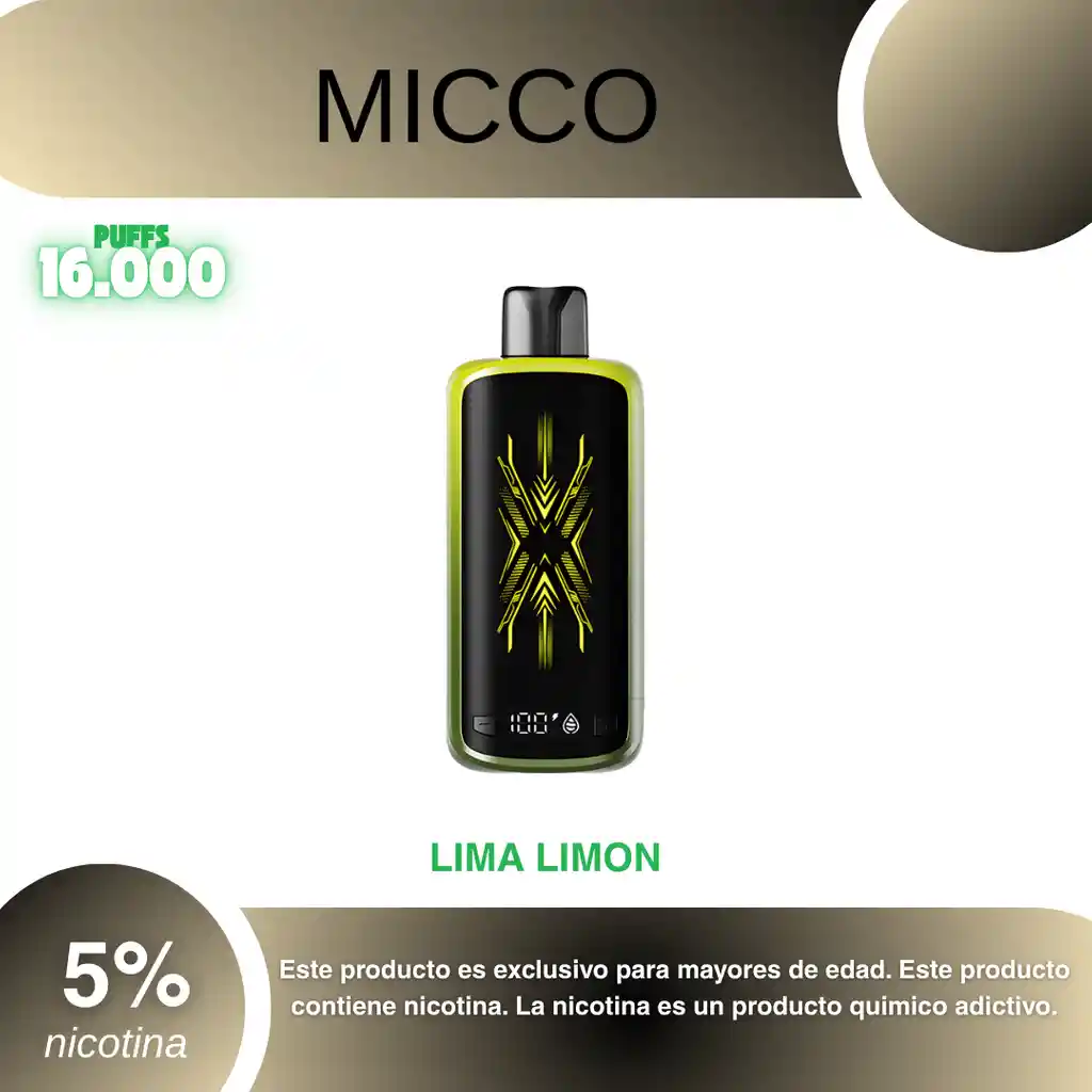 Micco N 16.000 Puffs, Sabor Lima Limon 5% PROHIBIDA LA VENTA A MENORES DE EDAD. ADVERTENCIA: ESTE PRODUCTO CONTIENE NICOTINA, LA NICOTINA ES UNA SUSTANCIA QUIMICA ADICTIVA Y NOCIVA PARA LA SALUD. Los líquidos para vapeo contienen: propilenglicol USP, glicerina USP, sabor artificial y nicotina. Este producto puede contener nicotina, una sustancia altamente adictiva que puede generar dependencia, posibles afectaciones arteriales, cardiacas, pulmonares y otras aun no identificadas. No se recomienda su uso a mujeres en embarazo, puede generar lesiones al feto. Mantener alejado de niños y mascotas. No ingerir, puede generar irritación y/o intoxicación. Por favor antes de consumir consulte a su médico posibles afectaciones o sensibilidad a alguno de sus componentes. Los componentes de este producto pueden aumentar la sensación de ansiedad En caso de notar alguna reacción adversa por favor suspenda su uso de manera inmediata. Siga las instrucciones en el envase. No alterar sus componentes. Adquiera sus productos en sitios de confianza No use productos piratas, alterados, o en los cuales no pueda comprobar su buena procedencia, Verifique la reputación del fabricante y distribuidor antes de adquirir cualquier producto Si no es usuario fumador o vapeador no se recomienda su uso bajo ninguna circunstancia Al usar este producto usted es consciente que este producto puede generar afectaciones a su salud, incluyendo aquellas que a la fecha de la compra no se han identificado y que pueden aparecer a largo plazo