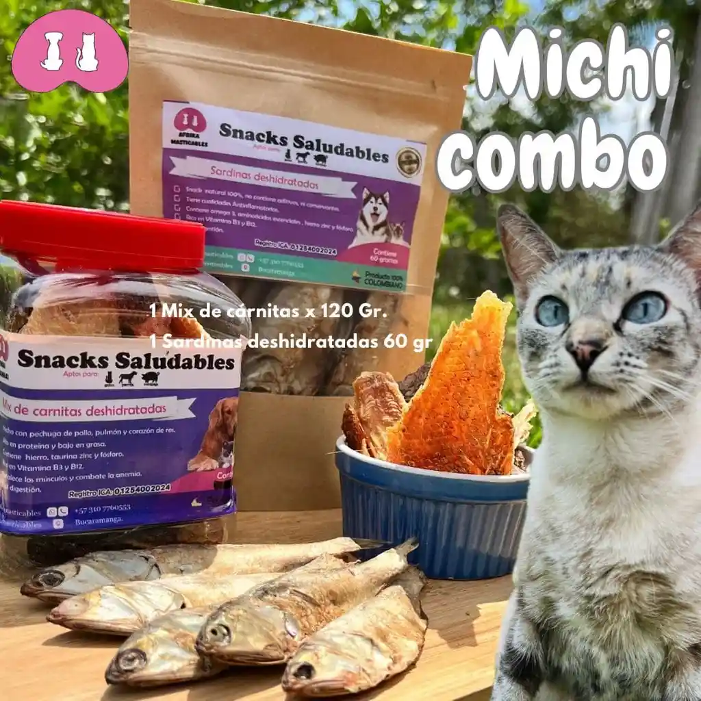 CONTIENE: 1 MIX DE CARNITAS X 120 G Y 1 SARDINAS DESHIDRATADAS. Pensado en gatos exigentes!!! El mix de carnitas es multivitamínico rico en taurina, aminoácido escencial en la dieta de los gatos; a su vez nuestras sardinas deshidratadas son una fuente de Omega 3 y 6 ideal para fortalecer su sistema inmunológico y cardiovascular