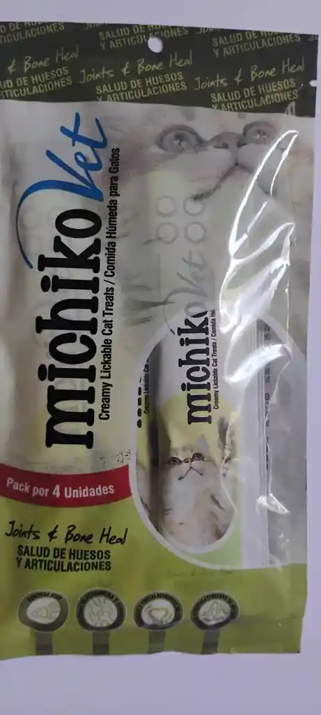 Snack cremoso para gatos adultos. Michiko Vet Joints & Bone Heal ayuda al cuidado de huesos y articulaciones gracias a su fórmula con glucosamina y condroitina. Ideal como premio o complemento alimenticio. Sobre de 15g.
