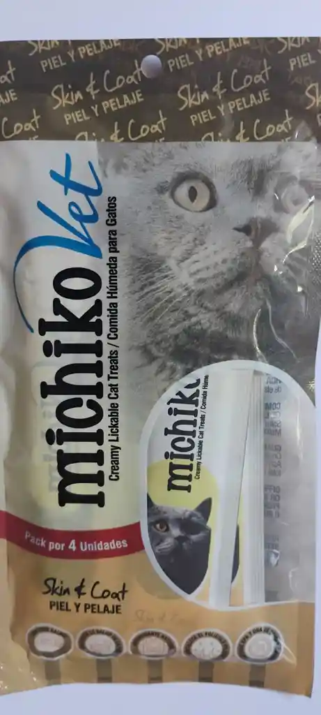 Snack cremoso gatos adultos. Michiko Vet Skin & Coat ayuda a cuidar la piel y el pelaje gracias a su fórmula con salmón y omega. Ideal como premio o complemento alimenticio. Sobre individual de 15 g.