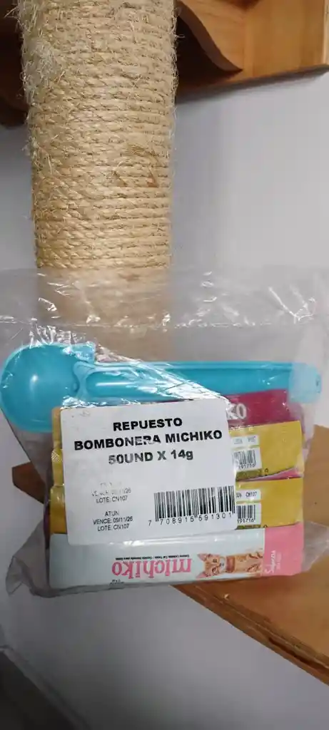 COMIDA HÚMEDA PARA GATOS. Alimento Completo y Balanceado. En sabores de ATÚN Y SALMÓN. Respuesto de bombonera 50 Sachets de 14g. C/u. ATÚN 25 Unidades. SALMÓN 25 Unidades. MICHIKO ATÚN: es un suplemento alimenticio para gatos de todas las edades y razas. Asegúrese de que su mascota tenga acceso a agua fresca. Mantenga el producto en un lugar seco y fresco. INGREDIENTES: Agua, Atún, Espesantes, Extracto de pescado, Vitamina E, Colorantes. ANÁLISIS GARANTIZADO Proteína 10,0% Grasa 0,10% (min) Ceniza 3,00% (max) Fibra 1.00% (max) Humedad 88.0% (max) Contenido calórico (calculado) 50.0 kcal / 100g. Registro Invima 16834. MICHIKO SALMÓN. INGREDIENTES: Agua, Salmón, Espesantes, Extracto de pescado, Vitamina E, Colorantesna 9,00% Grasa 0,50% (min) Ceniza 3,00% (max) Fibra 1.00% (max) Humedad 89.0% (max) Contenido calórico (calculado) 53.0 kcal / 100g. Registro Invima 16833. Este producto es para alimentación complementaria.