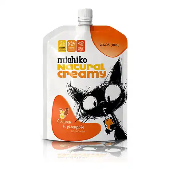 es un snack cremoso para gatos Michiko Natural Creamy sabor Yema y Vegetales. Es un suplemento alimenticio diseñado para gatos de todas las edades y razas. Su presentación es en un empaque tipo sachet, con un peso de 100g. Este producto está formulado para alimentación intermitente o suplementaria. Se puede encontrar en tiendas de productos para mascotas o en línea. es un alimento húmedo cremoso para gatos de la marca Michiko, sabor pollo y piña. Nombre del producto: Michiko Natural Creamy Chicken & Pineapple. Tipo de alimento: Paté o alimento húmedo cremoso para gatos. Sabor: Pollo y piña. Peso: 100g (3.53 oz). Disponibilidad: Se puede encontrar en tiendas de mascotas o en línea, como Laika Mascotas.
