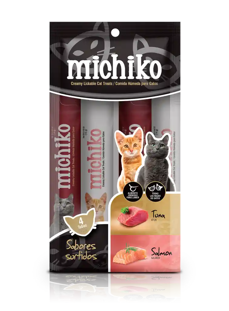 El Michiko Snack Cremoso Atún y Salmón 14 gr es un suplemento alimenticio para gatos de todas las edades y razas. Su textura cremosa lo hace ideal para ofrecer como premio o complemento en la alimentación diaria