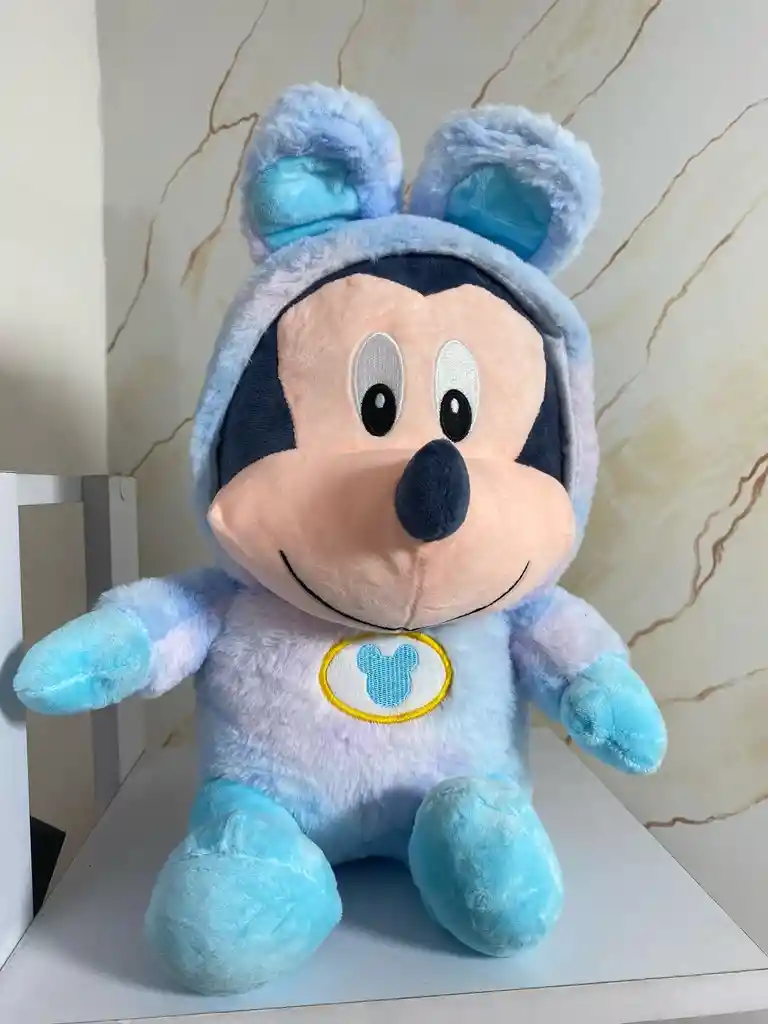 Hermoso peluche de Mickey mouse en pijama color celeste pastel, empaque y tarjeta feliz día.