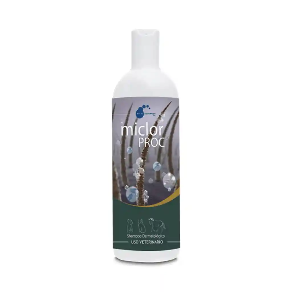 SHAMPOO MICLORPROC X 500 ML ES UN SHAMPOO DERMATOLÓGICO, ANTIFÚNGICO PARA EL TRATAMIENTO DE LAS FORMAS INFLAMATORIAS DE LA SEBORREA Y UNA AYUDA EN EL TRATAMIENTO DE LA DERMATITIS BACTERIANA E INFECCIONES FÚNGICAS DE LA PIEL EN PERROS, GATOS Y CABALLOS. MODO DE USO: AGÍTESE ANTES DE USAR. USO TÓPICO. HUMEDECER COMPLETAMENTE EL PELO DEL ANIMAL, LUEGO APLICAR EL SHAMPOO EN CANTIDAD SUFICIENTE Y MASAJEAR EN FORMA CIRCULAR PARA FORMAR ABUNDANTE ESPUMA. ASEGURAR QUE SE APLICA EN TODAS LAS ÁREAS DEL CUERPO DE DIFÍCIL ACCESO (DEBAJO DE LA COLA, PLIEGUES INGUINALES). DEJAR ACTUAR POR 10 MINUTOS Y ENJUAGAR CON AGUA LIMPIA; SECAR CON TOALLA Y CEPILLAR. REPETIR SEGÚN CRITERIO DEL MÉDICO VETERINARIO TRATANTE. USO EN: CANINOS (PERROS), FELINOS (GATOS) Y EQUINOS (CABALLOS)