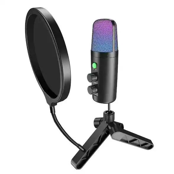 Micrófono de Condensador USB BM-502: Sonido Profesional para Cualquier Escenario El micrófono de condensador USB BM-502 ofrece un rendimiento excepcional para grabaciones, transmisiones en vivo, podcasts y más. Diseñado con tecnología avanzada, garantiza un sonido claro y profesional en cada uso. Características Principales: Calidad de Captura de Sonido: Tecnología de cancelación de ruido que elimina interferencias externas para un audio claro y profesional. Sensibilidad de 25 mV/Pa (-36 dB ± 2 dB), ideal para capturar detalles ricos y precisos. Funciones Avanzadas: Control de volumen del micrófono y audífono para ajustes personalizados. Función de silencio integrada para un control rápido durante transmisiones en vivo o grabaciones. Diseño y Materiales: Fabricado con una combinación de aleación de zinc y plástico para mayor durabilidad y estética. Efecto de luz RGB con cambio de color para un toque moderno y atractivo en tu configuración. Compatibilidad Total: Alimentación a través de USB DC 5V para facilitar su uso en computadoras y laptops. Conector para auriculares, permitiendo monitoreo en tiempo real del sonido capturado. NOTA: Garantía de 30 días por desperfecto de fábrica, no daños humanos.