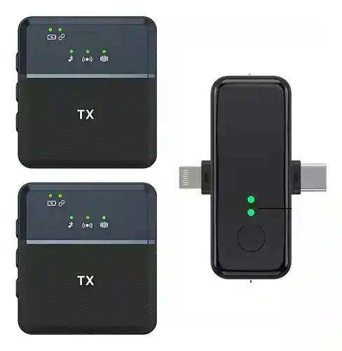 Micrófono de solapa inalámbrico doble compatible con equipos Android e iPhone. Este dispositivo admite efecto de reverberación y retorno de la oreja en tiempo real, y es multifuncional. Es plug play y conexión automática, para un uso fácil y cómodo. Ofrece una experiencia de grabación alta fidelidad y clara, gracias a su reducción de ruido inteligente DSP y captación de sonido omnidireccional de 360 grados. Fabricado con material ABS, su tecnología inalámbrica de 2,4 GHz asegura una transmisión estable y anti interferencia. Dimensiones: longitud de 4,7 cm, ancho de 4,3 cm y altura de 1,1 cm. Batería de gran capacidad para una larga duración. Adecuado para portátiles, altavoces, amplificadores, teléfonos móviles, cámaras, tabletas, videocámaras, etc. Especificaciones técnicas: - Conexión Tipo C y iPhone - Versión inalámbrica: 2,4G/compatible con Bluetooth 4,2 - Distancia de recepción: sin obstáculos 20-30m - Batería del micrófono: 300mAh (incluida) - Batería del receptor: 300mAh (incluida) - Relación señal-ruido: 90dB - Rango de frecuencia: nueva transmisión inalámbrica - Retardo de transmisión: 30 M/S - Rango de respuesta de frecuencia: 20Hz-20KHz - Tipo de señal: omnidireccional - Tiempo de carga: aproximadamente 2H - Horas de trabajo: aproximadamente 12H - Puerto de carga: Tipo C - Entrada nominal: DC5V/500MA - Características: Mini, ligero, sensible Contenido del paquete: - 1 x Micrófono inalámbrico - 2 x Receptor - 1 x Manual de usuario - 1 x Cable de carga