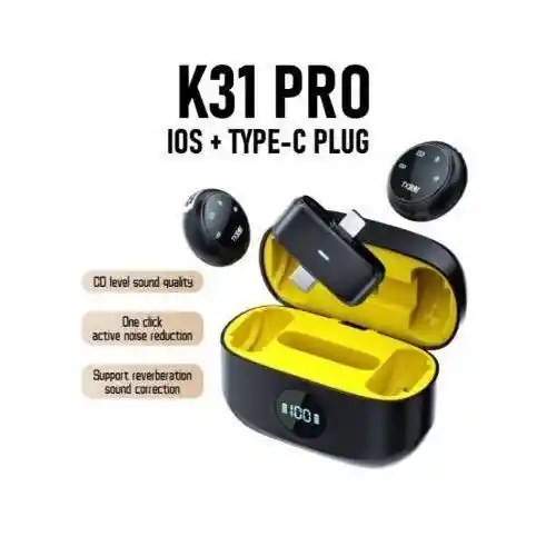 Micrófono de solapa dual con clip modelo K31, ideal para grabaciones, entrevistas y transmisiones con audio claro usando dos micrófonos simultáneamente.