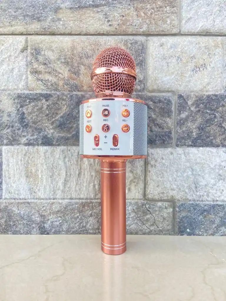 Este es un micrófono karaoke inalámbrico con parlante integrado. características: 🎤 Micrófono todo en uno • Micrófono + altavoz incorporado • Ideal para karaoke, grabaciones y entretenimiento 📶 Conectividad • Bluetooth (para conectar con celular, tablet u otros dispositivos) • Compatible con apps de karaoke y música 🔊 Controles integrados • VOL + / VOL –: subir y bajar volumen • MIC VOL: control del volumen del micrófono • PREV / NEXT: cambiar canción • PAUSE / PLAY • REC: grabación de voz • REMIX / ECO: efectos de sonido (eco/remix) 🎶 Funciones adicionales • Grabación de audio • Efecto eco para karaoke • Reproducción de música directamente desde el micrófono