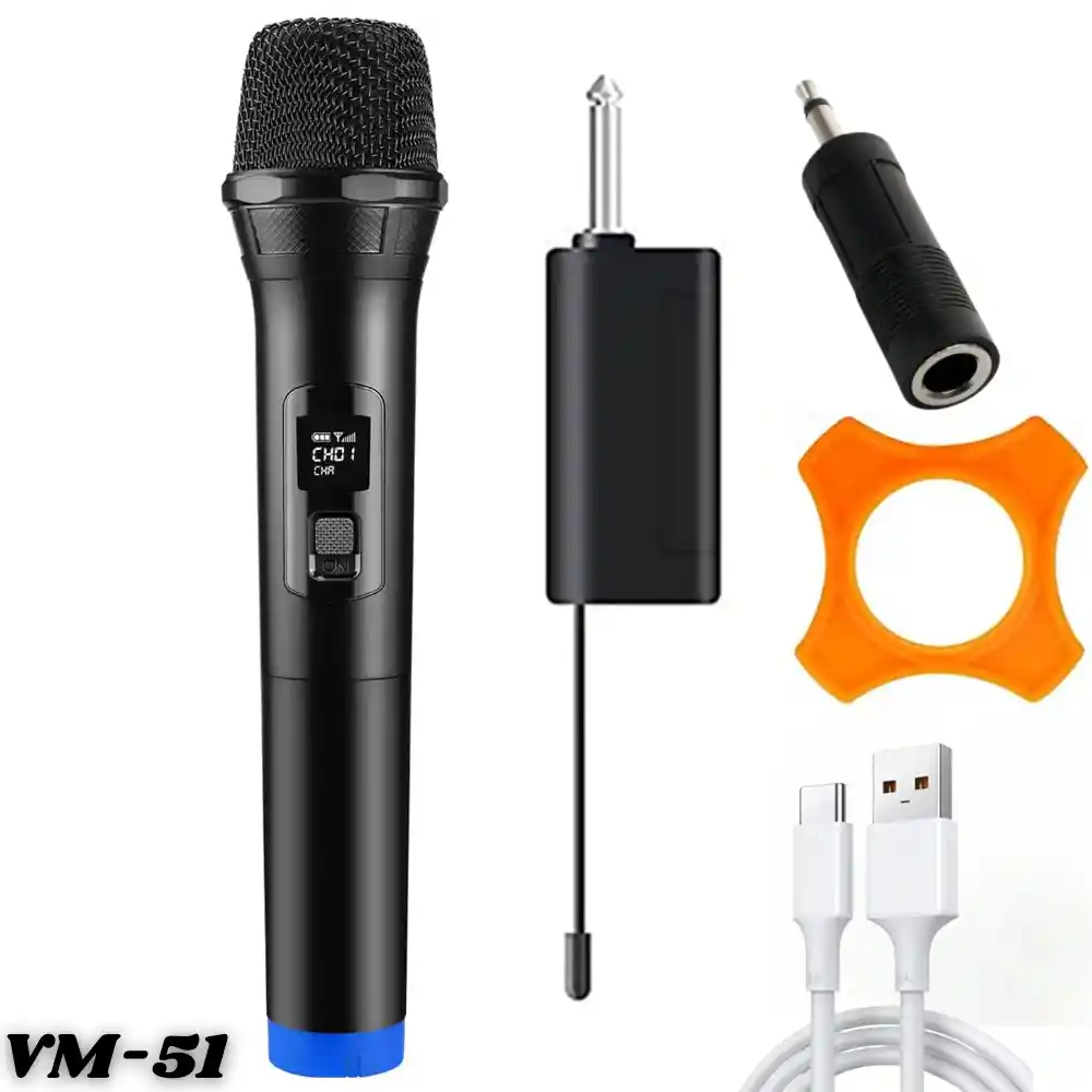 Microfono Inalambrico Karaoke Receptor Universal Recargable Vm-51 ¿Cansado de estar limitado por cables? este micrófono te ofrece la libertad y versatilidad que necesitas para expresarte al máximo. - Modo inalámbrico: Disfruta de la libertad de movimiento en el escenario o en cualquier espacio gracias a su gran alcance. Calidad de sonido excepcional Rango de frecuencia amplio que reproduce fielmente todos los matices de tu voz. Diseño robusto y portátil: Fabricado con materiales duraderos. Diseño compacto y ligero para transportarlo fácilmente a donde vayas. Ideal para cantantes, músicos, presentadores y cualquier persona que necesite amplificar su voz. Perfecto para actuaciones en directo, podcasts, eventos y más. ESPECIFICACIONES: Sensibilidad del micrófono: -72db Alcance inalámbrico: Hasta 5 metros (APROX) Incluye: Micrófono inalámbrico Receptor Cable Tipo C de carga para el receptor 2 * Baterías AA (INCLUIDAS) 1 * Bateria 18650 Recargable