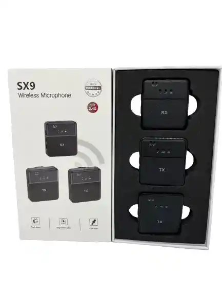 El SX9 Wireless Microphone es un sistema de micrófono inalámbrico compacto y portátil, ideal para creadores de contenido, clases en línea, entrevistas, transmisiones en vivo y grabaciones con celular o cámara. Ofrece sonido claro y estable gracias a su tecnología inalámbrica de 2.4G, permitiendo libertad de movimiento sin pérdida de audio.Características ✅ Tecnología inalámbrica 2.4G de transmisión estable ✅ Incluye 1 receptor (RX) y 2 transmisores (TX) ✅ Sonido claro, nítido y sin interferencias ✅ Diseño compacto, ligero y fácil de transportar ✅ Batería recargable integrada ✅ Conexión rápida Plug & Play (no requiere apps) ✅ Ideal para grabaciones, streaming, clases, vlogs y entrevistas ✅ Indicadores LED de funcionamiento ✅ Compatible con celulares, cámaras y otros dispositivosCuidados y Recomendaciones 🔌 Cargar completamente antes del primer uso 💧 Evitar el contacto con agua o humedad ☀️ No exponer a calor excesivo o luz solar directa 🧽 Limpiar con un paño seco y suave 📦 Guardar en su estuche cuando no se use 🔋 No dejar la batería descargada por largos periodos 🚫 Evitar golpes o caídas PRODUCTO IMPORTADO