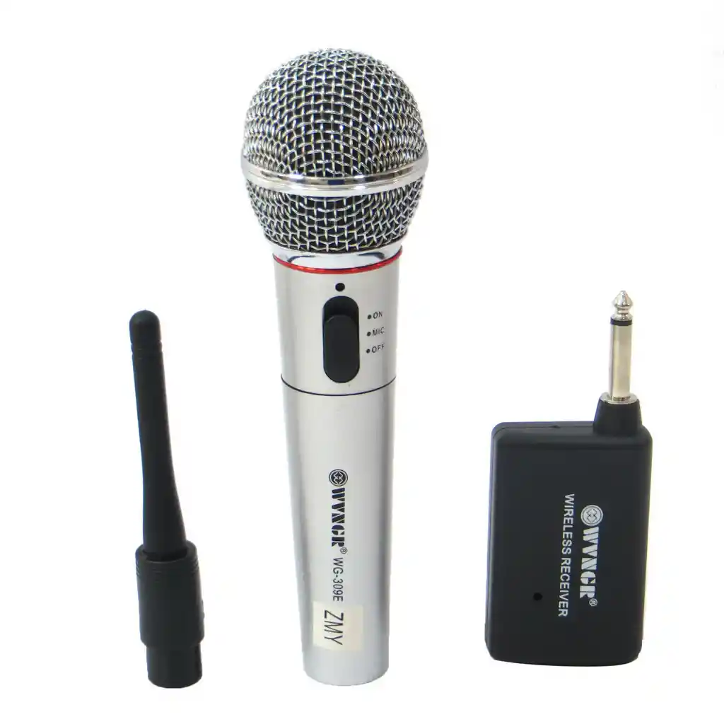 Micrófono profesional WVNGR WG-309B. Unidireccional (un canal). Funciona tanto de forma inalámbrica, gracias a un sistema de transmisor/receptor que se conecta al puerto Cannon del micrófono como a cualquier salida de 6,35 mm. Especialmente recomendado para su uso en karaoke, conferencias o entrevistas. Producto de excelente calidad de construcción, con cuerpo full metal y cabeza de malla de aluminio. Transmisión por radiofrecuencia, con un alcance de 20 metros. Usándolo normalmente, también encontrará el cable Cannon / jack de 6,35 mm de 230 cm de largo en el paquete. La transmisión inalámbrica es de calidad, sin interferencias ni ruidos estáticos. Frecuencia de emisión bien balanceada, excelente calidad de sonido. Interruptor de tres modos: ON, OFF y MIC (que estaría en espera). CARACTERÍSTICAS: Respuesta de frecuencia: 100Hz - 10000Hz (+/- 3dB) Resistencia de salida 600 Relación S/R: 60dB Distancia de funcionamiento: hasta 20 m Tipo: FM Fuente de alimentación del micrófono: batería AA de 1,5 V (incluida en el paquete) Fuente de alimentación del receptor: batería AA de 1,5 V (incluida en el paquete) Tamaño del micrófono: 180 X 55 mm. Cable Cannon para micrófono de hilo de 230 cm de largo.