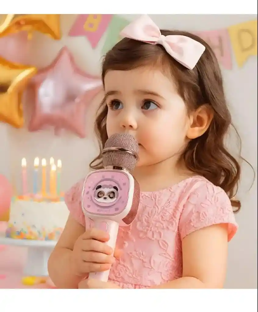 Características principales - Diseño adorable: Color rosa con detalle de personaje infantil en la parte frontal, ligero y ergonómico para manos pequeñas. - Inalámbrico y portátil: Conectividad Bluetooth, sin cables que limiten el juego; se puede usar en casa, fiestas o viajes. - Funciones múltiples: Actúa como micrófono, altavoz y tiene efectos de voz divertidos (eco, cambio de tono). - Material seguro: Fabricado con plásticos no tóxicos y esquinas redondeadas, apto para niños a partir de 3 años. - Batería duradera: Carga USB, hasta 4 horas de uso continuo con una sola carga.