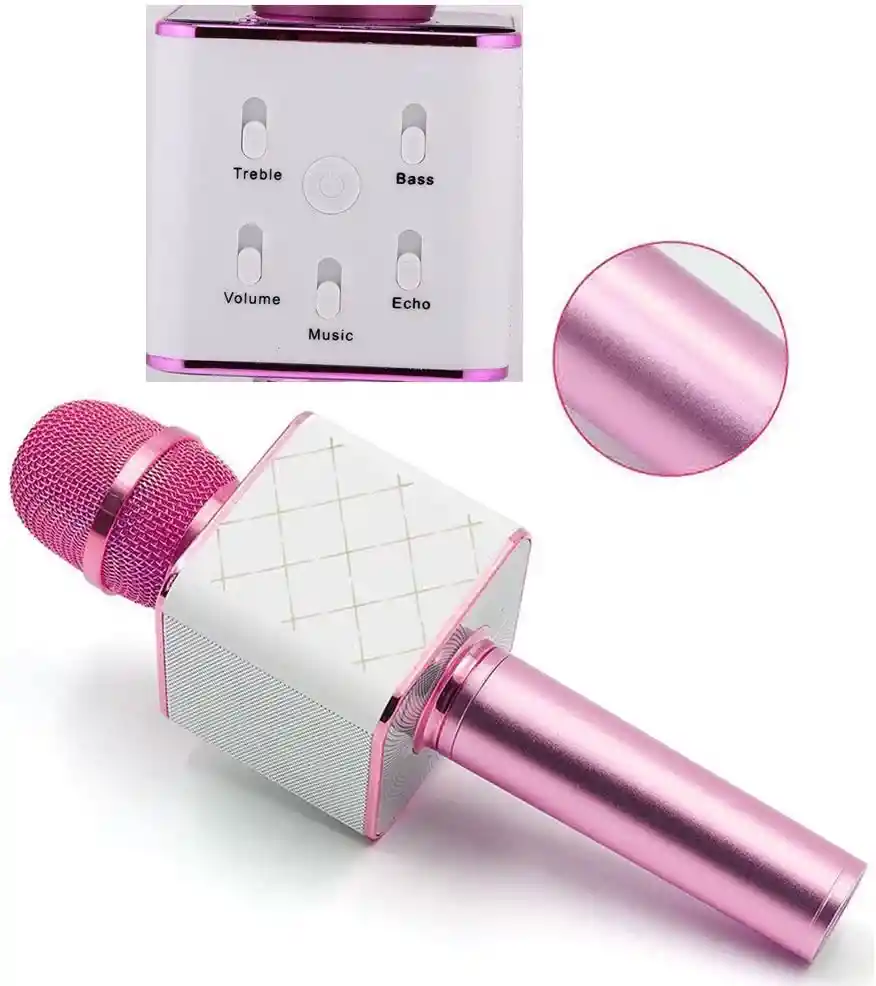 Micrófono Karaoke Bluetooth Con Estuche Q7 Portátil Parlante. CARACTERISTICAS: * Micrófono Karaoke cuenta con conexión Bluetooth. * Control individual para el volumen de la música y el volumen del micrófono. * Control de eco. * Control de brillos y graves. * Conexión Bluetooth hasta 10 metros. * Tiempo de carga aproximado 4 horas * Tiempo de funcionamiento hasta 8 horas * Incluye cable USB. DESCRIPCION: - Diviértete por montones con este Micrófono Karaoke, Ahora podrás ser el alma de la fiesta y cantar tus canciones favoritas mientras disfrutas con tus amigos. Este Micrófono Karaoke cuenta con conexión Bluetooth para que lo conectes a tu celular y puedas escuchar la canción que vas cantando. También puedes ponerle una Memoria USB y con el control de eco podrás darle un efecto diferente y divertido a tu voz. ESPECIFICACIONES: * Puerto USB * Potencia 3W x 2 * Voltaje de carga 5V * Tamaño empaque: 28 alto x 12 ancho x 7cm largo * Tamaño producto: 24 alto x 7 ancho x 7cm largo * Incluye estuche y cable USB.