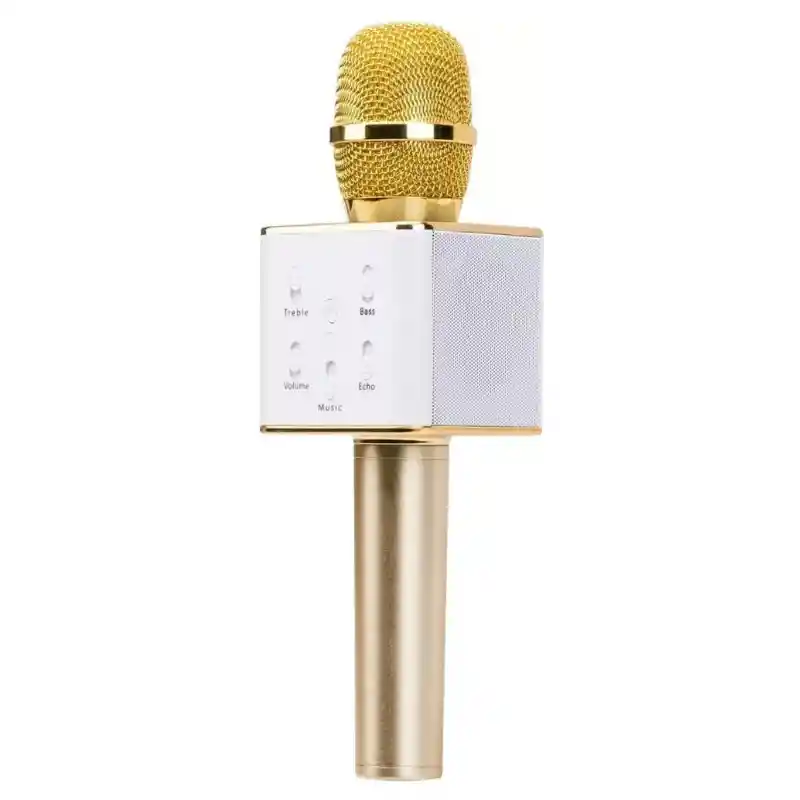 Ahora podrás ser el alma de la fiesta y cantar tus canciones favoritas mientras disfrutas con tus amigos. Este Micrófono Karaoke cuenta con conexión Bluetooth para que lo conectes a tu celular y puedas escuchar la canción que vas cantando. También puedes ponerle una Memoria USB y con el control de eco podrás darle un efecto diferente y divertido a tu voz. NOTA: NO ES AMPLIFICADOR DE SONIDO, la conexion Bluetooth se utiliza para reproducir las pistas en el parlante integrado de 3W del mismo micrófono... No lo compares con microfonos profesionales, este es un juguete de diversión para niños y jovenes, regalo ideal para navidad, cumpleaños, etc. Conectalo por bluetooth a tu móvil tablet o PC y reproduce tus pistas favoritas directamente en el parlante del micrófono! Características Principales: - Conexión Bluetooth hasta 10 metros - Puerto USB - Potencia 3W x 2 - Voltaje de carga 5V - Control de eco - MP3: Reproduce música conectando directamente una USB al Micrófono - Control de brillos y graves - Control individual para el volumen de la música y el volumen del micrófono - Funciones y efectos: Eco, Estéreo, cancelación de música, volumen - Compatible para iOs y Android - Botones táctiles de Adelantar, Atrasar, Play y pausa - 2 Bocinas Laterales - Diseño ligero - Rango de frecuencia 100Hz - 10KHz - Tiempo de recarga aproximado 4 horas - Tiempo de funcionamiento entre 5 y 8 horas - Incluye cable USB - Dimensiones del Producto en Cms: Ancho 7, Alto 25, Largo 7 Peso en Kgs: Menor 1KG - Dimensiones del Empaque en Cms: Ancho 12, Alto 8, Largo 29. Peso en Kgs: Menor 1KG Lo que Obtienes con tu compra: 1-Micrófono Karaoke Q7 1-Cable USB