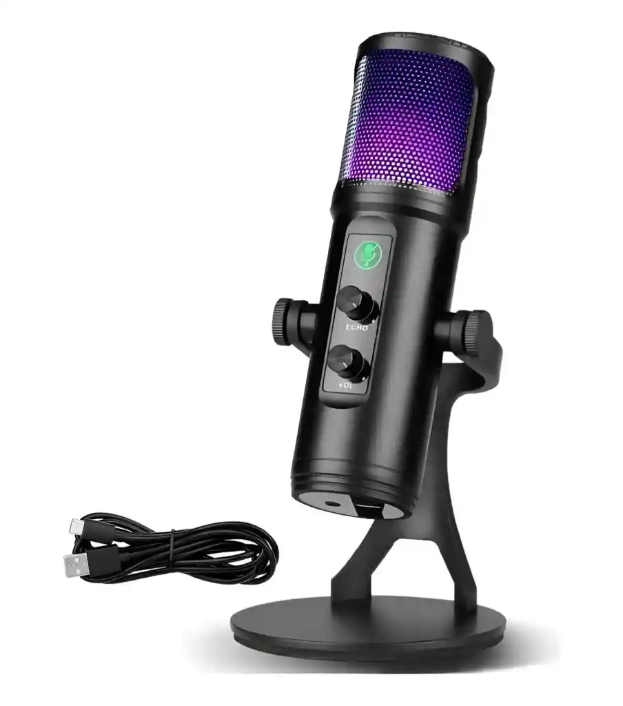 Perfecto para podcast, vídeo en vivo, ASMR, entrevistas en estudio, entre otras aplicaciones. Con volumen ajustable y control de ECO. Con filtro de rejilla metálica para mejorar la calidad de audio. CARACTERÍSTICAS: - Luz RGB - Volumen ajustable - Efecto eco ajustable - Compatible con Windows - Botón táctil para silenciar - Cable USB largo aproximado 140 cm TE ENTREGAMOS: 1-Microfono Profesional Condensador Omnidireccional USB Luz RGB 1-Cable USB 1-Manual (En inglés)