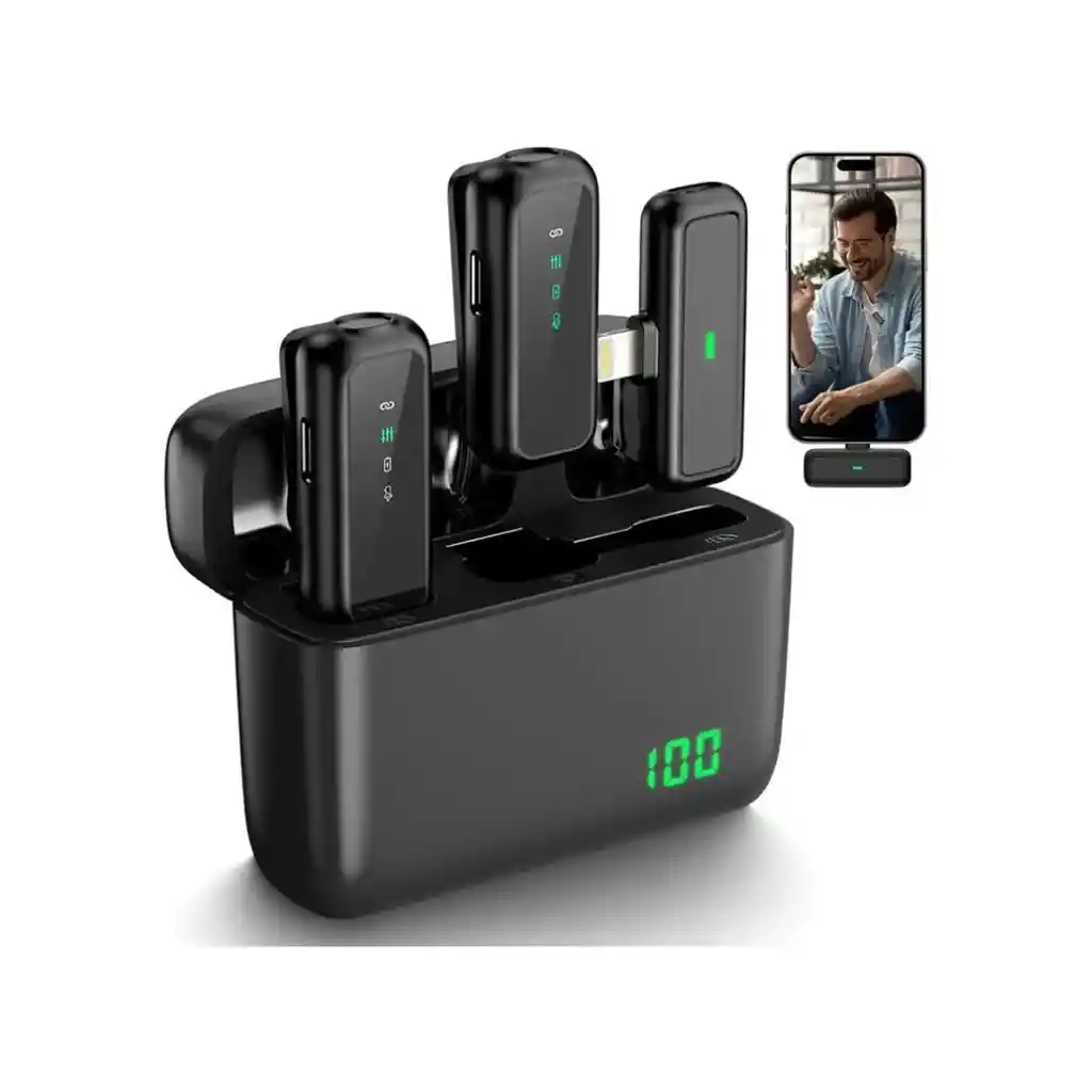 Micrófono Inalámbrico de Solapa para iPhone – Grabación Profesional con Doble Transmisor Diseñado para iPhone y iPad Este micrófono inalámbrico de solapa ha sido desarrollado específicamente para usuarios de iPhone y iPad, proporcionando una experiencia de grabación profesional y sin interrupciones. Con dos transmisores y un receptor, permite grabación de doble pista, ideal para entrevistas, podcasts, vlogs y cualquier proyecto audiovisual que requiera una calidad de sonido superior. Tecnología inalámbrica de última generación Gracias a su tecnología inalámbrica 2.4G, este micrófono ofrece una conexión estable y un rango de transmisión de hasta 66 pies (bajo condiciones accesibles), lo que garantiza libertad de movimiento y una grabación clara en cualquier entorno. Batería de larga duración para creadores de contenido Uso continuo de hasta 8 horas con una sola carga. La funda de carga extiende el tiempo de uso a 48 horas, permitiendo sesiones de grabación prolongadas sin interrupciones. El receptor también carga el iPhone y el micrófono, asegurando un rendimiento óptimo durante toda la grabación. Cancelación de ruido avanzada y calidad de audio profesional Filtro POP y reducción de ruido inteligente de un solo toque, eliminando sonidos no deseados y mejorando la claridad de la voz. Micrófono omnidireccional con sensibilidad de hasta -26 dB, capturando cada detalle de manera precisa para un audio natural y de alta fidelidad. Fácil de usar con función Plug & Play Emparejamiento automático para una configuración rápida y sencilla. Pantalla LCD transparente que muestra el estado del micrófono en tiempo real. Control táctil intuitivo, permitiendo ajustes rápidos sin necesidad de aplicaciones adicionales. Herramienta ideal para creadores de contenido Este micrófono es perfecto para YouTubers, influencers, vloggers, podcasters y creadores de contenido en redes sociales como TikTok e Instagram. Ofrece la libertad de grabar con calidad profesional en cualquier lugar, sin cables ni complicaciones. Contenido del paquete 1 x Micrófono de solapa doble 1 x Cable de carga Este micrófono inalámbrico para iPhone es la mejor opción para quienes buscan calidad de audio superior, facilidad de uso y larga duración de batería en sus grabaciones.