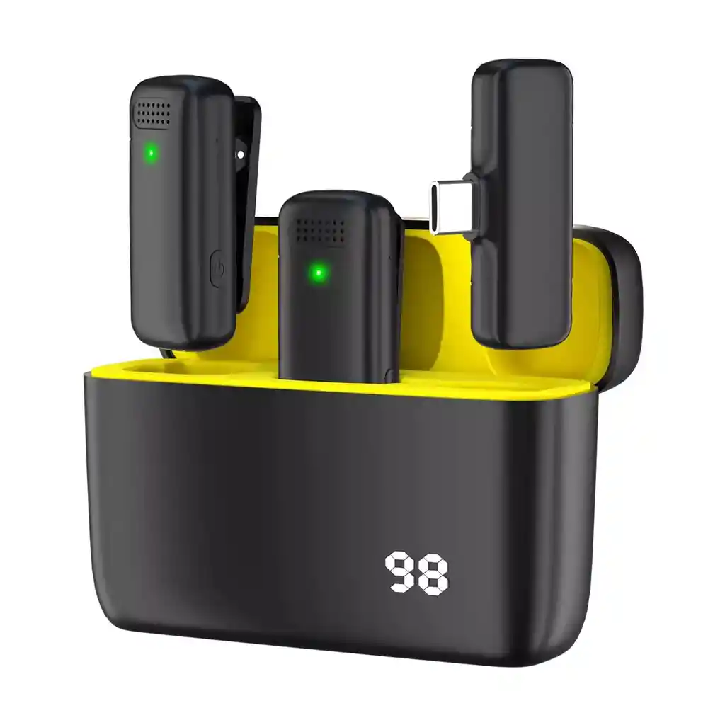 Nuestro micrófono inalámbrico dual solapero con entrada Tipo C y base de carga, graba los audios de tus videos con una calidad profesional. Estos micrófonos vienen con una base de carga practica y eficiente para una duración de la batería de hasta 6 – 7 horas. - Producto 100 % original – Micrófono Inalámbrico Dual Tipo C . - Graba audio con tu celular con calidad profesional. - Batería de litio de 800 mAh. - Compatibilidad con dispositivos Android con entrada Usb C. - Admite la carga del celular mientras el Receptor del micrófono está conectado. - Patrón polar: Omnidireccional. - Distancia máxima de transmisión 20 metros. - Duración batería: 6 – 7 horas. - Carga hasta 3 veces con la Base. - Tiempo aproximado de carga: 1.5 hora.