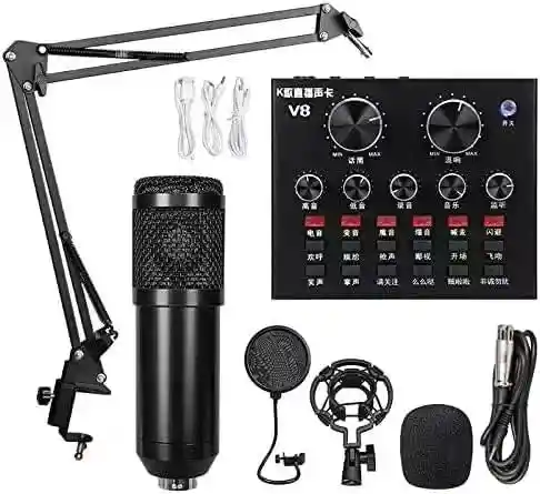 * Equipo profesional: este kit de micrófono de condensador contiene un micrófono BM-800, soporte de choque, filtro pop, soporte de brazo de tijera de suspensión ajustable, tapa de espuma antiviento, cable de alimentación, tarjeta de sonido en vivo y tarjeta de sonido de computadora. * Este equipo de estudio fue diseñado para podcasting, streaming y grabación de música y video corto. * Lo que obtienes es un conjunto completo de equipo de podcast profesional. Un juego puede satisfacer todas tus necesidades. * Excelente calidad de sonido: este micrófono es adecuado para grabación y transmisión de estudio, este micrófono tiene una frecuencia de muestreo de 120 kHz y una tasa de bits de 24 bits, asegurando que tu voz se capture con alto detalle. * El patrón de captación cardioide ofrece una captura impecable y precisa, que es más adecuada para grabar podcasts, voces y otros trabajos de voz. * El micrófono de condensador graba la fuente de sonido frente al micrófono directamente y proporciona un sonido rico y suave. * Alta compatibilidad: este dispositivo de efectos de sonido se puede utilizar en cualquier teléfono móvil, computadora, PS4, Xbox, Switch, sistemas Apple iOS, sistemas Android y cualquier plataforma de juego. * incluso conectarse a dos teléfonos móviles para transmitir en vivo en ambas plataformas de transmisión al mismo tiempo. * Cumple con el uso de todos los escenarios: juegos, transmisión en vivo, podcasting, voz en off, grabación de música, Live and Sing, tomar video en TikTok, YouTube, etc. * Bajo nivel de ruido: proporciona a los cantantes una interpretación vocal clara y sin plosivos, Y tiene menos distorsión en el proceso de grabación debido a las características de una alta relación señal-ruido (SNR). en cualquier teléfono móvil, computadora, efectos se pueden utilizar, No necesita software de controlador adicional. * Puede conectarse a diferentes dispositivos (computadora/teléfono móvil/computadora portátil) utilizando diferentes métodos de conexión. * Este paquete de equipos de podcast te traerá más diversión y hará que tu grabación sea más creativa.
