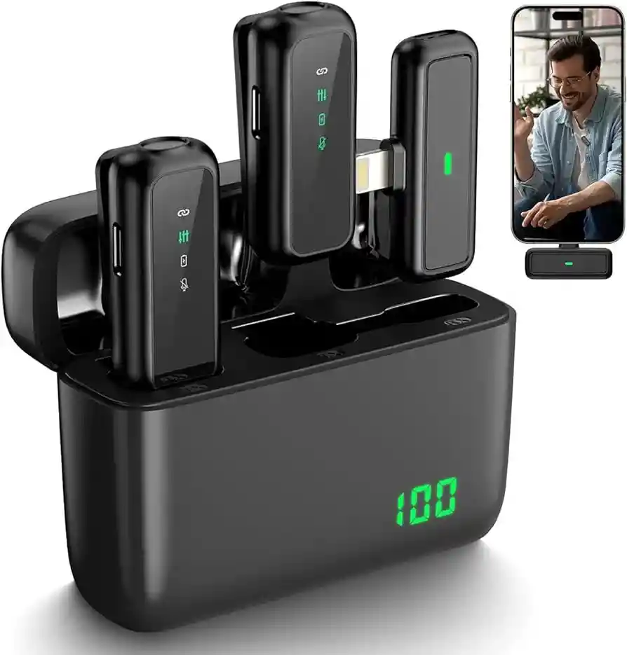 Funciones y Detalles: Plug and Play: Un micrófono inalámbrico para el iPhone que no requiere adaptadores, Bluetooth o aplicaciones. Simplemente inserta el receptor en tu dispositivo y enciende el micrófono portátil. Estos dos componentes se emparejarán automáticamente. Larga duración de la batería: dos micrófonos inalámbricos no solo pueden cargarse solos, sino que también tienen una duración de la batería de las cajas de carga. Hacer que no tenga que preocuparse por los problemas de electricidad durante las transmisiones y entrevistas diarias al aire libre en vivo. Reducción inteligente de ruido: El micrófono inalámbrico está configurado con reducción de ruido inteligente con chip DSP, y reconoce eficazmente el sonido original y la grabación clara en el entorno de ruido. Grabación de sonido: 66 pies (65.6 ft) sin obstaculizar el rango de transmisión, entrelazamiento inalámbrico y grabación de 360 °, lo que te hace grabar video de manera más casual. Uso de la escena: El mini micrófono está intercalado en la ropa, puede entrevistas, grabación de video y transmisión en vivo en cualquier momento y en cualquier lugar. Lo que obtienes: 2 TX (2 transmisores) + 1 RX (1 receptor) + funda de carga + cable de carga + instrucciones (idioma español no garantizado).