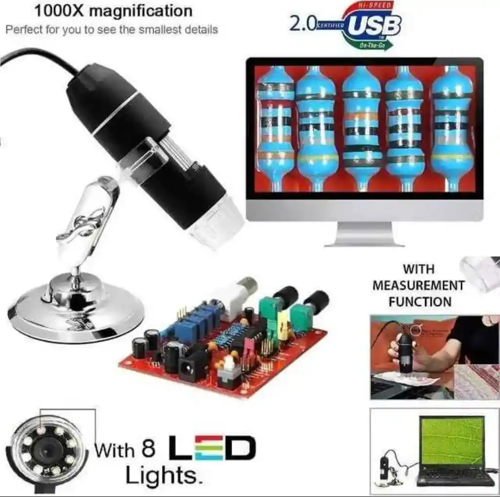1. Microscopio práctico y útil para niños, estudiantes, ingenieros, inventores y otras personas que necesitan ampliar y explorar las micro cosas. 2. Profesional, más versátil, se puede aplicar a la investigación de laboratorio, componentes electrónicos, identificación de joyas, etc. 3. Lupa 1600x. 4. 8 luces LED integradas, la perilla de ajuste del microscopio digital puede cambiar el enfoque y el brillo. 5. Sensor CMOS de color HD, DSP de 24 bits, súper resolución 640 * 480 a 2592 * 1944, zoom digital 5X, contiene software de medición digital y regla de calibración, compatible con USB3.0 amp; USB 2.0 y amperio; USB 1.1. 6. Funciona con Windows 2000/2003/XP/Vista/ 7/8/10. 7. Rango de enfoque: de 10 mm a 250 mm 8. Relación de aumento: 1600x 9. Formato de video: AVI 10. Formato de foto: JPEG 0 BMP 11. Fuente de luz: 8 LED (ajustable mediante rueda de control) 12. Interfaz de PC: USB1.0 amp; USB2.0