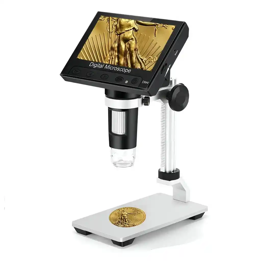 Este microscopio USB se usa ampliamente para inspección de control de calidad, inspección con fines educativos, impresión industrial, colecciones como joyería, inspección industrial textil y biológica, así como inspección industrial: material de PCB y material relevante. Luces LED de 8 piezas: la lupa está equipada con luces LED de 8 piezas y tiene lentes ópticas de alta calidad que ayudan a ver con claridad incluso en entornos con poca luz. Aumento 1000X: el microscopio electrónico tiene un aumento 1000X y admite ajuste de enfoque. Resolución de PC y velocidad de transmisión de imágenes: 1280×720/26FPS. Pantalla grande: el microscopio digital tiene una pantalla LCD de 4,3 pulgadas que le permite ver objetos fácilmente. Portátil: este microscopio tiene un tamaño compacto y peso liviano, soporte de plástico y soporte de aleación de aluminio para elegir. Las imágenes producidas se pueden transferir fácilmente a un monitor de computadora mediante un puerto USB. Pantalla LCD a todo color de 4,3 pulgadas- Utilizando una lente de alta definición de 720P, la pantalla LCD de 4,3 pulgadas muestra imágenes claras en tiempo real y vídeo de alta calidad, con 8 luces de relleno LED. En comparación con los oculares tradicionales, la pantalla grande mejora la ergonomía y elimina la tensión en los ojos y el cuello. Zoom de aumento continuo de 50X-1000X- Le permite acercar y ver detalles increíbles en el rango de aumento de 50X a 1000X. La ampliación real difiere según el tamaño de la pantalla, la distancia entre la cámara y las observaciones. Vista de PC- También puede conectar el microscopio al puerto USB de una PC con Windows y obtener un campo de visión más amplio e imágenes más claras. Es compatible con computadoras y portátiles con sistema Windows XP Vista 7 8 10 11. No es compatible con Mac u otros sistemas. 8 luces LED ajustables- Las 8 luces LED ajustables integradas proporcionan una iluminación amplia y uniforme. Puedes ajustar libremente el brillo con el interruptor giratorio. Permite tomar fotografías o grabar videos en el bosque y algún lugar oscuro. Grabación y reproducción de vídeos de imágenes- El videomicroscopio no es solo un microscopio, sino también una cámara que permite tomar fotografías y vídeos. Las imágenes y los videos se guardarán en la tarjeta micro SD y se podrán ver en la pantalla del microscopio o en la PC. (Soporte máximo para tarjeta micro SD de 32 GB. La tarjeta SD no está incluida). Fácil de usar: fácil de montar, enfocar y ver pequeños detalles. Microscopio digital LCD versátil para inspeccionar monedas, placas de circuitos, plantas, encartes, joyas, sellos y más. Una herramienta de aprendizaje ideal para adultos, estudiantes con mentalidad científica y niños. LA COMPRA INCLUYE: 1X MICROSCOPIO 4.3 PULGADAS 1000X
