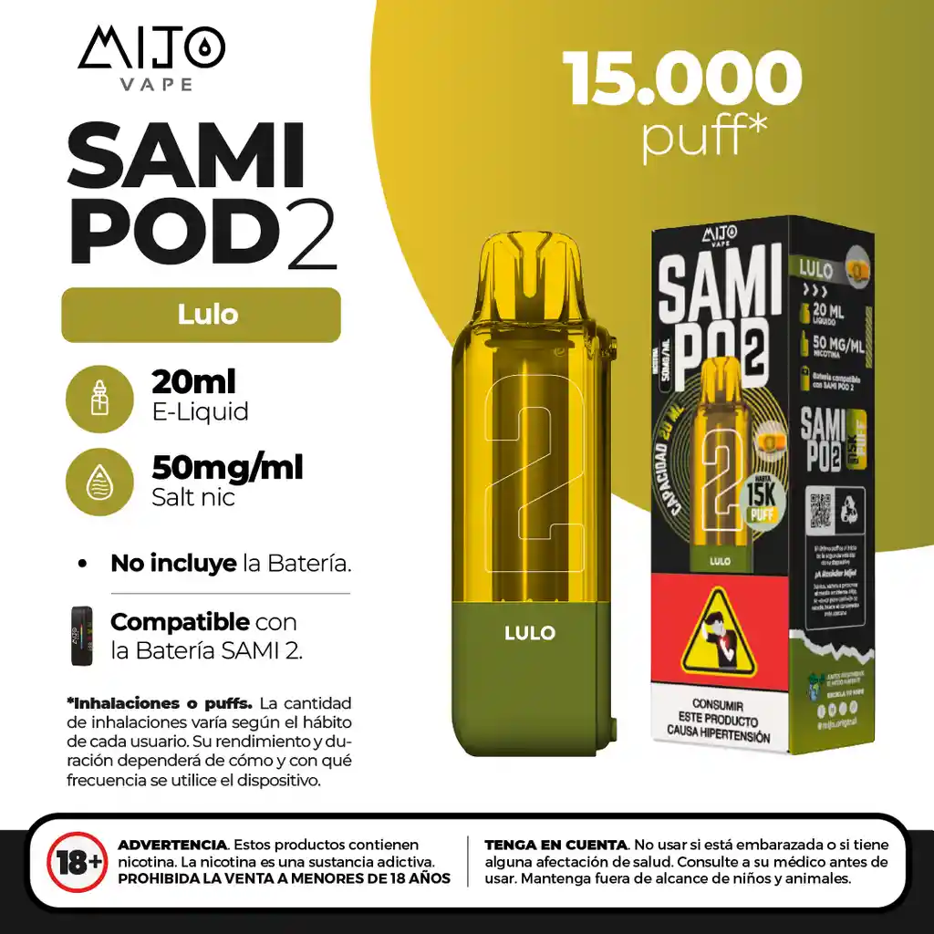 Mijo Sami Pod 2 Lulo 15.000 Puff , compatible con bateria Sami 2. Pod y bateria se venden por separado. 20 ML 5% Nicotina.
