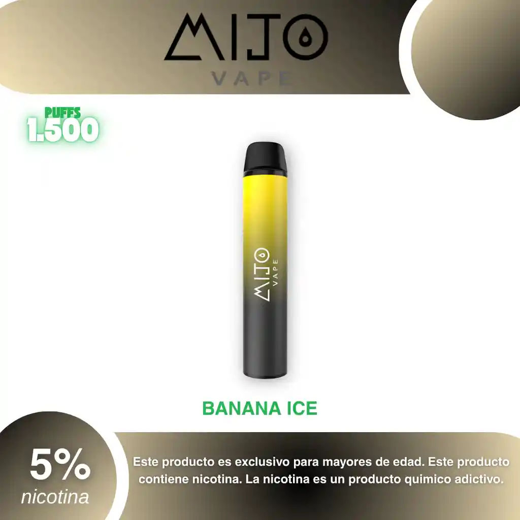 Mijo Vape 1.500 Puffs Sabor Banana Ice 5% PROHIBIDA LA VENTA A MENORES DE EDAD. ADVERTENCIA: ESTE PRODUCTO CONTIENE NICOTINA, LA NICOTINA ES UNA SUSTANCIA QUIMICA ADICTIVA Y NOCIVA PARA LA SALUD. Los líquidos para vapeo contienen: propilenglicol USP, glicerina USP, sabor artificial y nicotina. Este producto puede contener nicotina, una sustancia altamente adictiva que puede generar dependencia, posibles afectaciones arteriales, cardiacas, pulmonares y otras aun no identificadas. No se recomienda su uso a mujeres en embarazo, puede generar lesiones al feto. Mantener alejado de niños y mascotas. No ingerir, puede generar irritación y/o intoxicación. Por favor antes de consumir consulte a su médico posibles afectaciones o sensibilidad a alguno de sus componentes. Los componentes de este producto pueden aumentar la sensación de ansiedad En caso de notar alguna reacción adversa por favor suspenda su uso de manera inmediata. Siga las instrucciones en el envase. No alterar sus componentes. Adquiera sus productos en sitios de confianza No use productos piratas, alterados, o en los cuales no pueda comprobar su buena procedencia, Verifique la reputación del fabricante y distribuidor antes de adquirir cualquier producto Si no es usuario fumador o vapeador no se recomienda su uso bajo ninguna circunstancia Al usar este producto usted es consciente que este producto puede generar afectaciones a su salud, incluyendo aquellas que a la fecha de la compra no se han identificado y que pueden aparecer a largo plazo