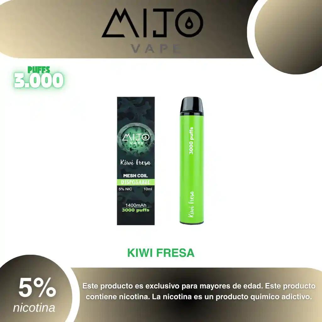 Mijo Vape 3.000 Puffs Sabor Kiwi Fresa 5% PROHIBIDA LA VENTA A MENORES DE EDAD. ADVERTENCIA: ESTE PRODUCTO CONTIENE NICOTINA, LA NICOTINA ES UNA SUSTANCIA QUIMICA ADICTIVA Y NOCIVA PARA LA SALUD. Los líquidos para vapeo contienen: propilenglicol USP, glicerina USP, sabor artificial y nicotina. Este producto puede contener nicotina, una sustancia altamente adictiva que puede generar dependencia, posibles afectaciones arteriales, cardiacas, pulmonares y otras aun no identificadas. No se recomienda su uso a mujeres en embarazo, puede generar lesiones al feto. Mantener alejado de niños y mascotas. No ingerir, puede generar irritación y/o intoxicación. Por favor antes de consumir consulte a su médico posibles afectaciones o sensibilidad a alguno de sus componentes. Los componentes de este producto pueden aumentar la sensación de ansiedad En caso de notar alguna reacción adversa por favor suspenda su uso de manera inmediata. Siga las instrucciones en el envase. No alterar sus componentes. Adquiera sus productos en sitios de confianza No use productos piratas, alterados, o en los cuales no pueda comprobar su buena procedencia, Verifique la reputación del fabricante y distribuidor antes de adquirir cualquier producto Si no es usuario fumador o vapeador no se recomienda su uso bajo ninguna circunstancia Al usar este producto usted es consciente que este producto puede generar afectaciones a su salud, incluyendo aquellas que a la fecha de la compra no se han identificado y que pueden aparecer a largo plazo