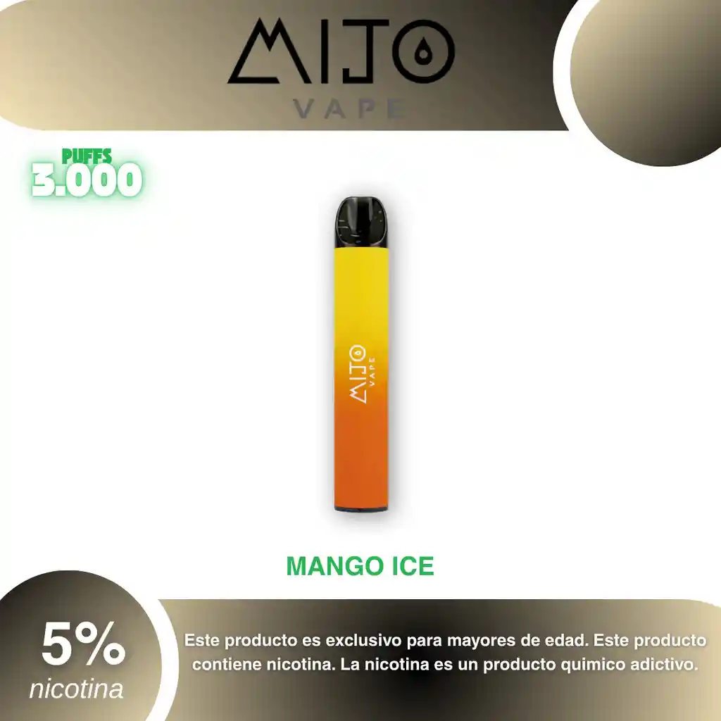 Mijo Vape 3.000 Puffs Sabor Mango Ice 5% PROHIBIDA LA VENTA A MENORES DE EDAD. ADVERTENCIA: ESTE PRODUCTO CONTIENE NICOTINA, LA NICOTINA ES UNA SUSTANCIA QUIMICA ADICTIVA Y NOCIVA PARA LA SALUD. Los líquidos para vapeo contienen: propilenglicol USP, glicerina USP, sabor artificial y nicotina. Este producto puede contener nicotina, una sustancia altamente adictiva que puede generar dependencia, posibles afectaciones arteriales, cardiacas, pulmonares y otras aun no identificadas. No se recomienda su uso a mujeres en embarazo, puede generar lesiones al feto. Mantener alejado de niños y mascotas. No ingerir, puede generar irritación y/o intoxicación. Por favor antes de consumir consulte a su médico posibles afectaciones o sensibilidad a alguno de sus componentes. Los componentes de este producto pueden aumentar la sensación de ansiedad En caso de notar alguna reacción adversa por favor suspenda su uso de manera inmediata. Siga las instrucciones en el envase. No alterar sus componentes. Adquiera sus productos en sitios de confianza No use productos piratas, alterados, o en los cuales no pueda comprobar su buena procedencia, Verifique la reputación del fabricante y distribuidor antes de adquirir cualquier producto Si no es usuario fumador o vapeador no se recomienda su uso bajo ninguna circunstancia Al usar este producto usted es consciente que este producto puede generar afectaciones a su salud, incluyendo aquellas que a la fecha de la compra no se han identificado y que pueden aparecer a largo plazo